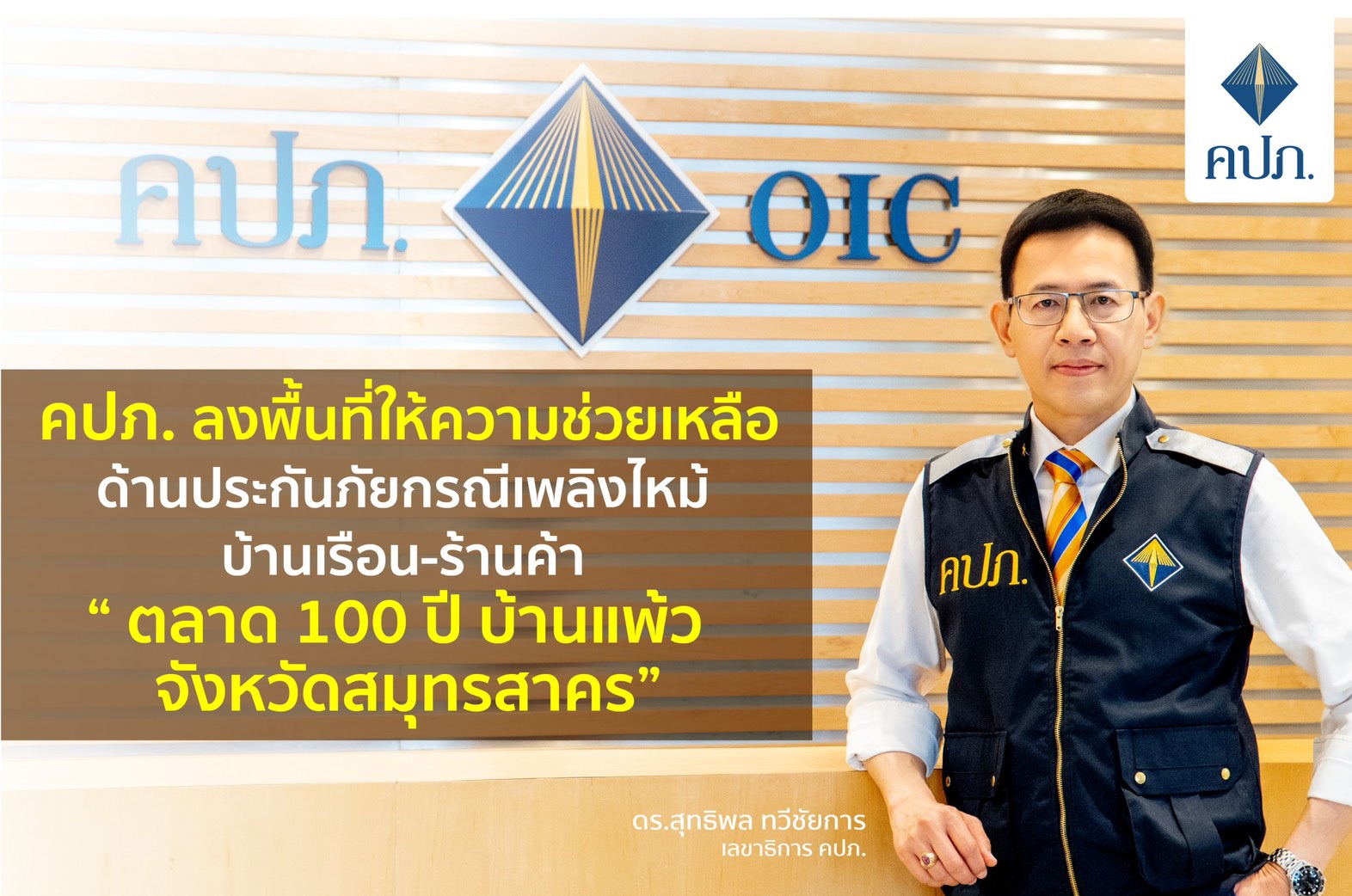 2 สิงหาคม 2564 : ดร. สุทธิพล ทวีชัยการ เลขาธิการคณะกรรมการกำกับและส่งเสริมการประกอบธุรกิจประกันภัย (เลขาธิการ คปภ.) เปิดเผยว่า จากกรณีเกิดเหตุเพลิงไหม้ตลาดริมน้ำ 100 ปี หมู่ที่ 1 ตำบลบ้านแพ้ว อำเภอบ้านแพ้ว จังหวัดสมุทรสาคร โดยเพลิงได้ลุกไหม้บ้านเรือนและร้านค้าเสียหาย 18 หลัง เหตุเกิดเมื่อวันที่ 31 กรกฎาคม 2564 เบื้องต้นได้สั่งการให้สายคุ้มครองสิทธิประโยชน์ และสำนักงาน คปภ. ภาค 7 (นครปฐม) และสำนักงาน คปภ. จังหวัดสมุทรสาคร เร่งช่วยเหลือและสำรวจความเสียหายอย่างเร่งด่วนผ่าน Platform
