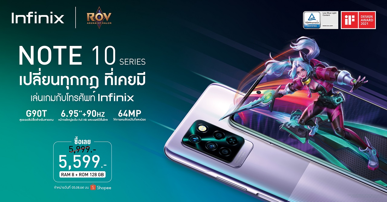 กรุงเทพฯ 2 สิงหาคม 2564 : อินฟินิกซ์ (Infinix) เปิดตัวเกมมิ่งสมาร์ตโฟนที่ดีที่สุดในช่วงราคาไม่เกิน 6,000 บาท โดย Infinix NOTE 10 Series มาพร้อมกับสโลแกน “Game Changer – เปลี่ยนทุกกฎที่เคยมี” ซึ่งครั้งนี้อินฟินิกซ์ได้ร่วมเป็นสปอนเซอร์ให้กับเกม RoV ในกิจกรรมสุดพิเศษ RoV Show Match Event และ RoV Pro league ที่มีเหล่าเซเลบริตี้ ยูทูบเบอร์ และนักแข่ง E-Sport มากมายมาร่วมในกิจกรรม
