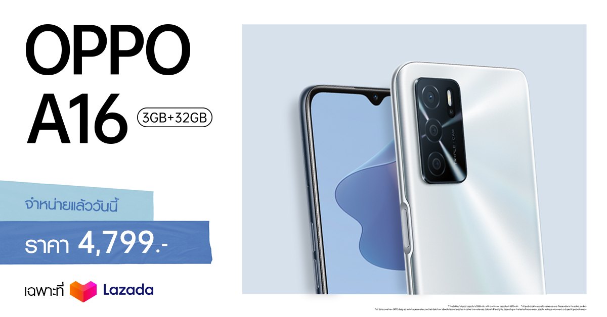 9 สิงหาคม 2564 : หลังจากได้รับกระแสตอบรับเป็นอย่างดีจากการเปิดจองสมาร์ทโฟนน้องเล็กรุ่นใหม่ล่าสุด OPPO A16 รุ่น RAM 3GB + ROM 32GB ไปเมื่อไม่นานมานี้ ล่าสุด OPPO ประกาศวางจำหน่ายอย่างเป็นทางการแล้ว ตั้งแต่วันที่ 8 สิงหาคม 2564 ในราคาเพียง 4,799 บาท พิเศษเฉพาะช่องทาง Lazada เท่านั้น