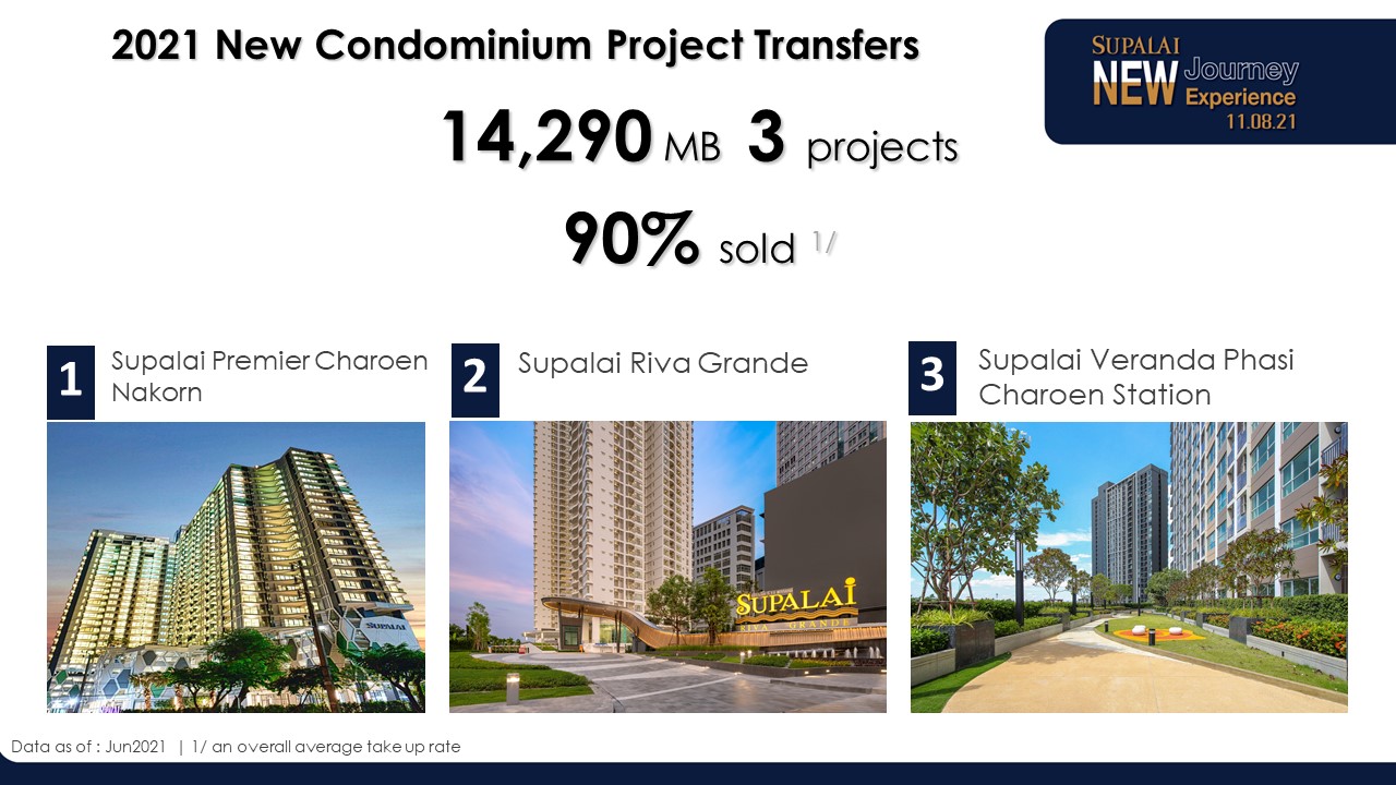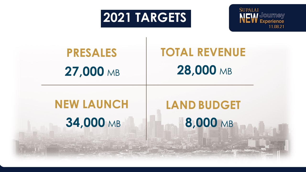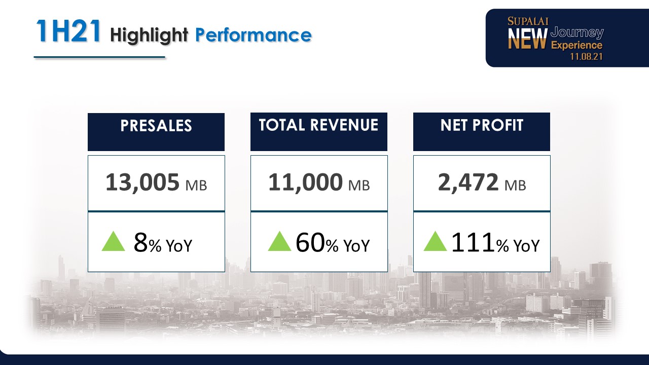 จากเป้าหมายยอดขายที่ตั้งไว้ 27,000 ล้านบาท อีกทั้งสามารถสร้างรายได้รวม 11,000 ล้านบาท เพิ่มขึ้น 60% โดยรายได้หลักมาจากการทยอยส่งมอบคอนโดมิเนียมทั้งในกรุงเทพฯ ปริมณฑล และต่างจังหวัด ขณะที่รายได้จากอสังหาริมทรัพย์สามารถแบ่งเป็นรายได้จากโครงการแนวราบ 57% และจากโครงการคอนโดมิเนียม 43% ถึงแม้ว่าตลาดกลุ่มคอนโดมิเนียมจะยังคงชะลอตัว บริษัทฯ สามารถทำผลงานด้านกำไรสุทธิ 2,472 ล้านบาท เพิ่มขึ้น 111% จากช่วงเวลาเดียวกันของปี 2563