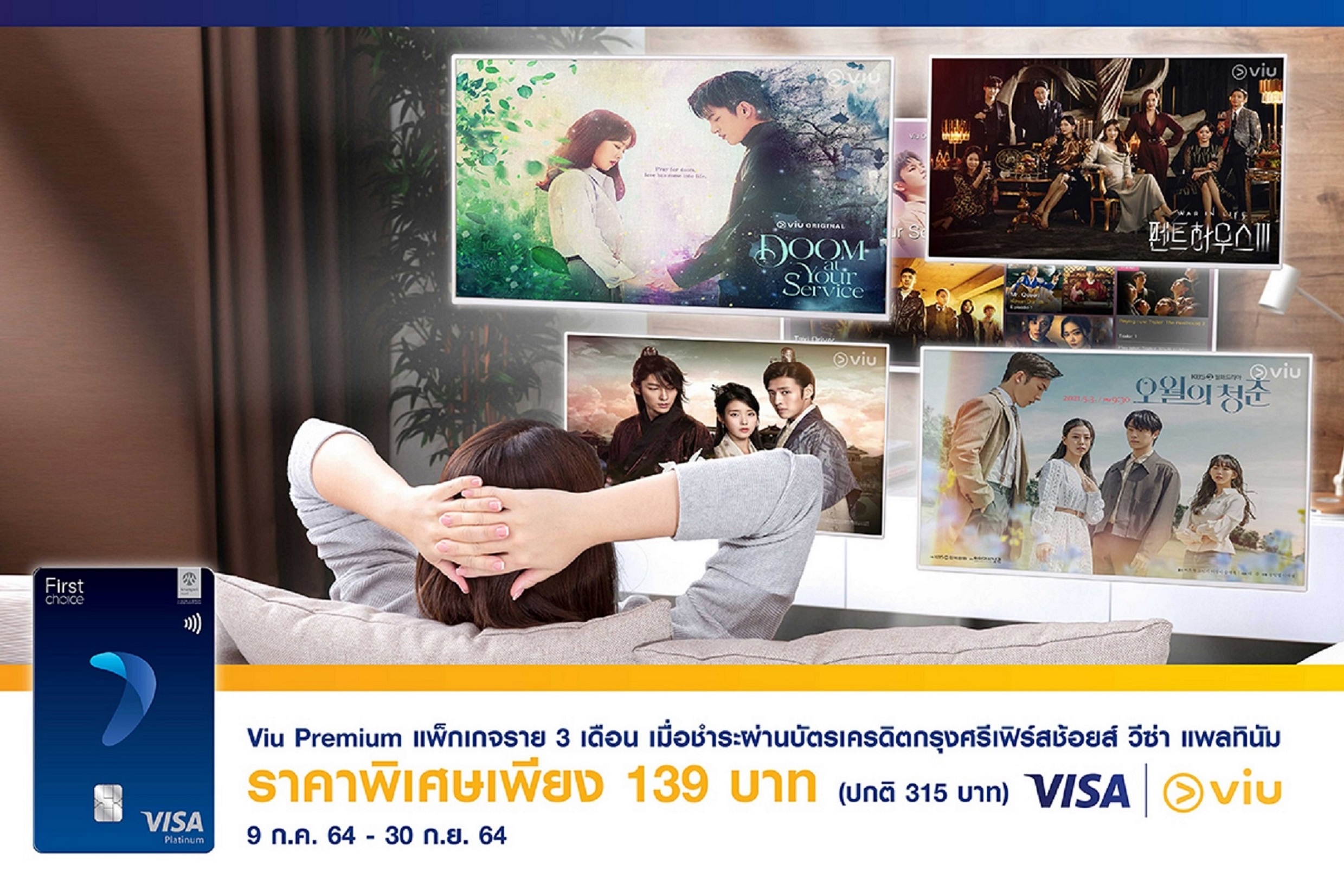 กรุงเทพฯ, 13 สิงหาคม 2564 : บัตรเครดิตกรุงศรีเฟิร์สช้อยส์ วีซ่า แพลทินัม จัดโปรพิเศษเอาใจคนรักซีรี่ส์เกาหลีและความบันเทิงระดับเอเชีย ชวนสมัครซื้อแพ็กเกจ ‘Viu Premium’ ราย 3 เดือน ในราคาเพียง 139 บาท (จากราคาปกติ 315 บาท) เพียงชำระค่าบริการครั้งแรกด้วยบัตรเครดิตกรุงศรีเฟิร์สช้อยส์ วีซ่า ผ่านเว็บไซต์ viu.com ตั้งแต่ 1 กรกฎาคม 2564 – 30 กันยายน 2564 (เงื่อนไขเป็นไปตามที่กำหนด) ข้อมูลเพิ่มเติม https://bit.ly/KFCVisa-Viu ![]()