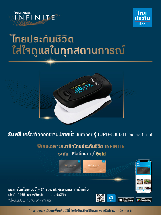ขณะเดียวกันสมาชิกไทยประกันชีวิต INFINITE ระดับ PLATINUM และ GOLD ยังได้สิทธิ์รับเครื่องวัดออกซิเจนปลายนิ้ว Jumper รุ่น JPD-500D ฟรี โดยสามารถรับสิทธิ์ผ่านแอปพลิเคชัน ไทยประกันชีวิตได้จนถึง 31 ธันวาคม 2564 ซึ่งผู้เอาประกันภัย 1 ท่านจะได้รับ 1 สิทธิ์ตลอดแคมเปญ