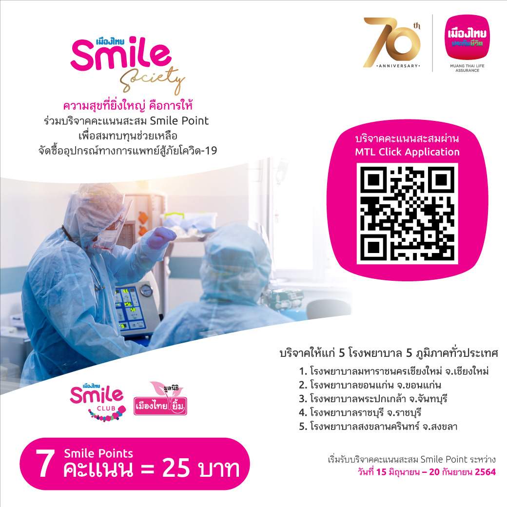 ตลอดจนการสร้างสรรค์กิจกรรม สิทธิประโยชน์และแคมเปญต่างๆ ต่อเนื่องตลอดทั้งปี 2564 เพื่อเป็นการเฉลิมฉลองครบรอบ 70 ปี เมืองไทยประกันชีวิตผ่าน “เมืองไทยสไมล์คลับ” ที่จะสร้างความสุขและรอยยิ้ม สำหรับสมาชิกเมืองไทยสไมล์คลับ ซึ่งสมาชิกฯ สามารถร่วมกิจกรรมแลกรับส่วนลด แลกรับสินค้า หรือแลกรับบริการผ่านแอปพลิเคชัน MTL Click ที่เมืองไทยสไมล์คลับจัดเตรียมเป็นพิเศษให้สมาชิกฯ สอดคล้องกับรูปแบบการใช้ชีวิตในปัจจุบัน ภายใต้สถานการณ์การแพร่ระบาดของโรคติดเชื้อไวรัสโคโรนา 2019 (COVID-19) ที่ยังไม่คลี่คลาย