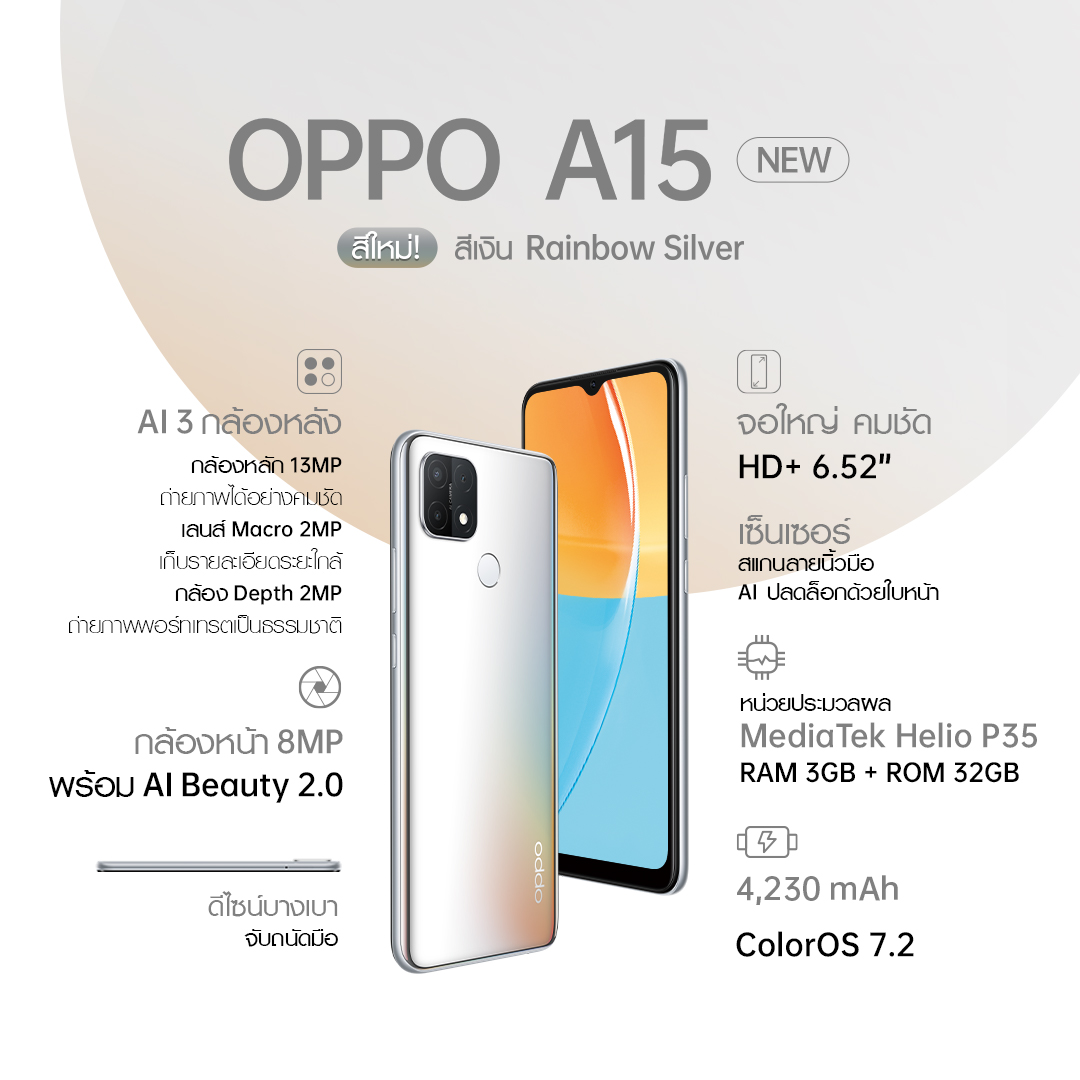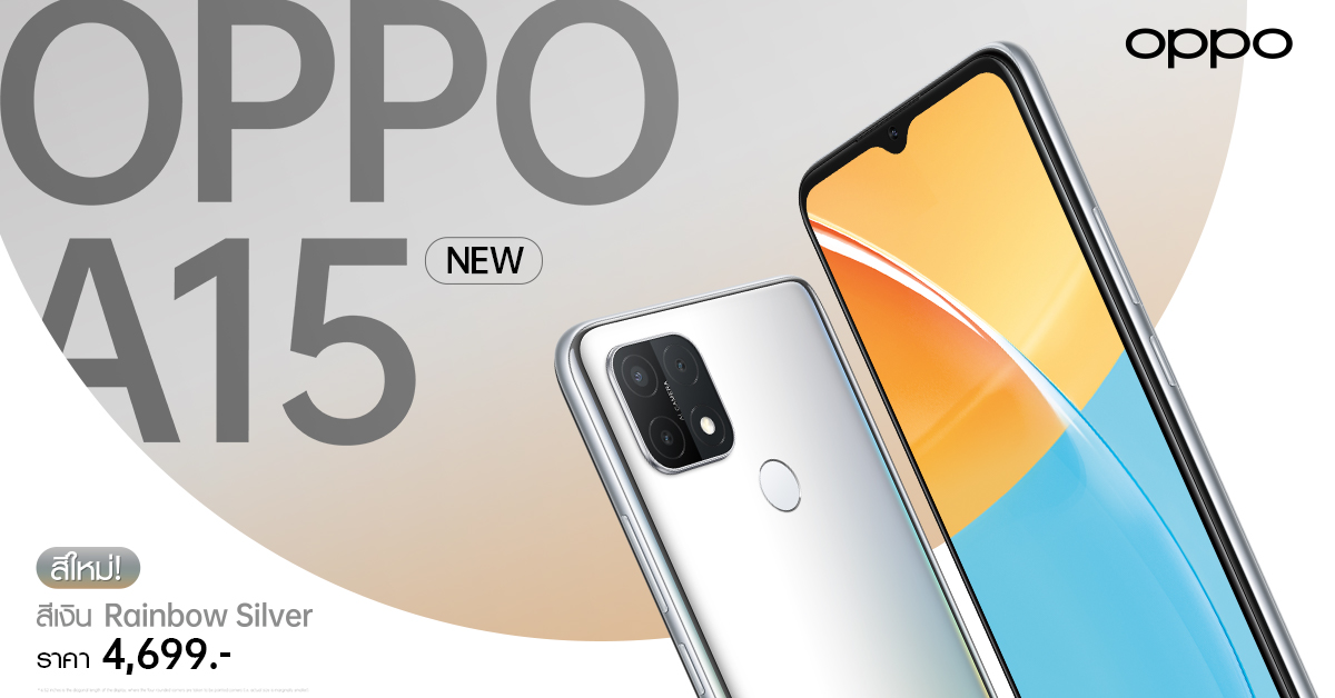 กรุงเทพฯ 17 สิงหาคม 2564 : OPPO ประกาศการกลับมาของสมาร์ทโฟนน้องเล็ก OPPO A15 NEW ที่ล่าสุด! มาในสีใหม่ สีเงิน Rainbow Silver สวยสะกดทุกสายตา โดยวางจำหน่ายพร้อมกันทั่วประเทศตั้งแต่วันที่ 20 สิงหาคม 2564 ในราคาเพียง 4,699 บาท เท่านั้น