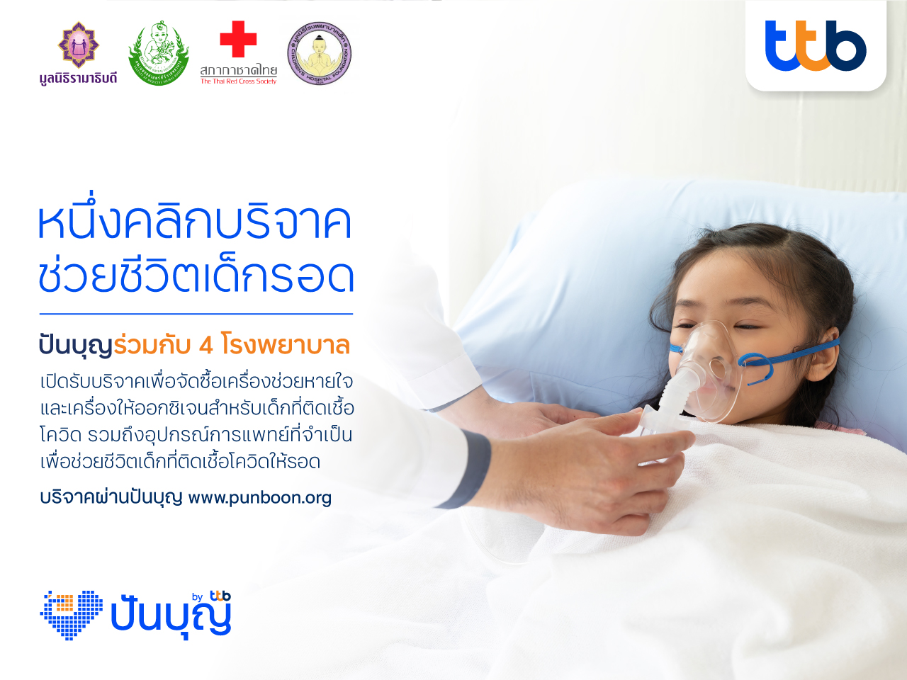 กรุงเทพฯ 20 สิงหาคม 2564 : ปันบุญ โดยทีเอ็มบีธนชาต หรือ ทีทีบี (ttb) ขอเชิญร่วมต่อลมหายใจให้กับเด็ก ๆ ที่ติดเชื้อโควิด-19 ในโครงการ “หนึ่งคลิกบริจาค.. .ช่วยชีวิตเด็กรอด” โดยร่วมกับ 4 โรงพยาบาล ได้แก่ มูลนิธิโรงพยาบาลรามาธิบดี, ศิริราชมูลนิธิ, โรงพยาบาลจุฬาลงกรณ์ สภากาชาดไทย และมูลนิธิโรงพยาบาลเด็ก เปิดรับบริจาคเพื่อจัดซื้อเครื่องช่วยหายใจ เครื่องให้ออกซิเจน และอุปกรณ์ทางการแพทย์ที่จำเป็น เพื่อช่วยชีวิตเด็กติดเชื้อโควิด-19