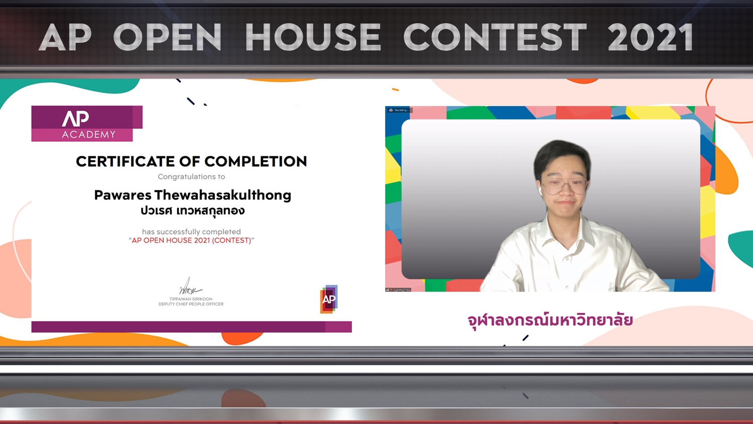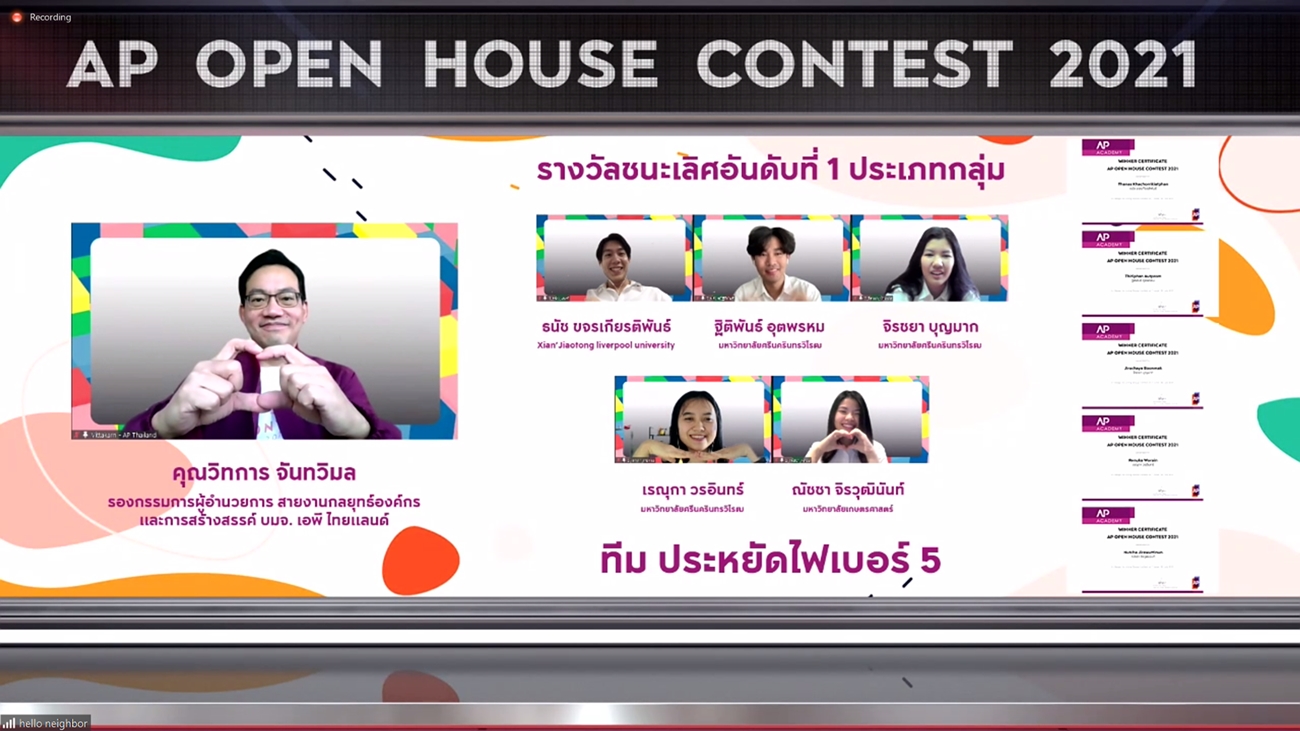 ล่าสุด เอพีได้จัดพิธี Virtual Award Ceremony มอบประกาศนียบัตรให้กับ 25 นักคิดนักสร้างสรรค์ รุ่นใหม่ พร้อมประกาศผลตัดสิน 5 ผู้แข่งขันที่มีผลงานโดดเด่น ทั้งประเภททีมและประเภทเดี่ยว