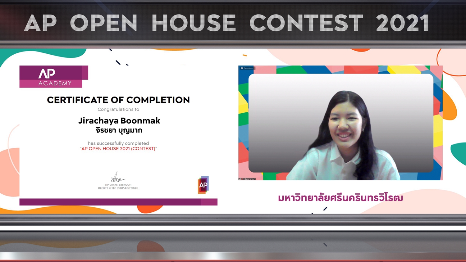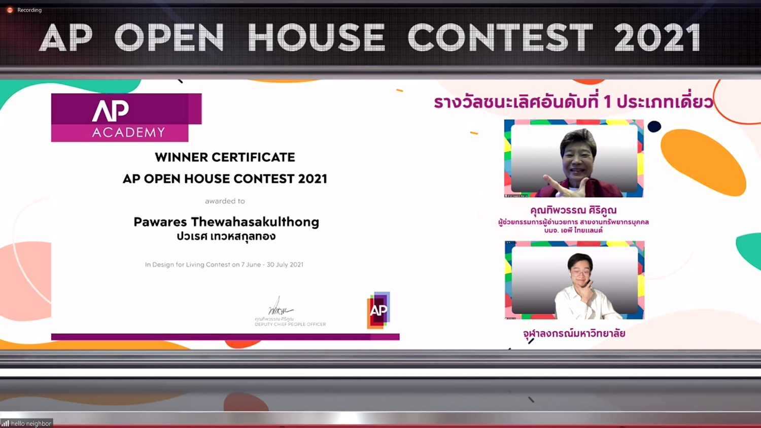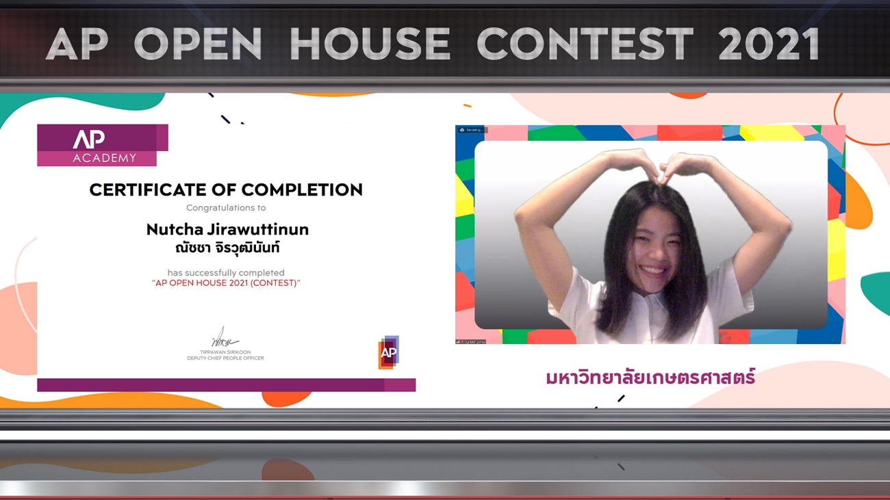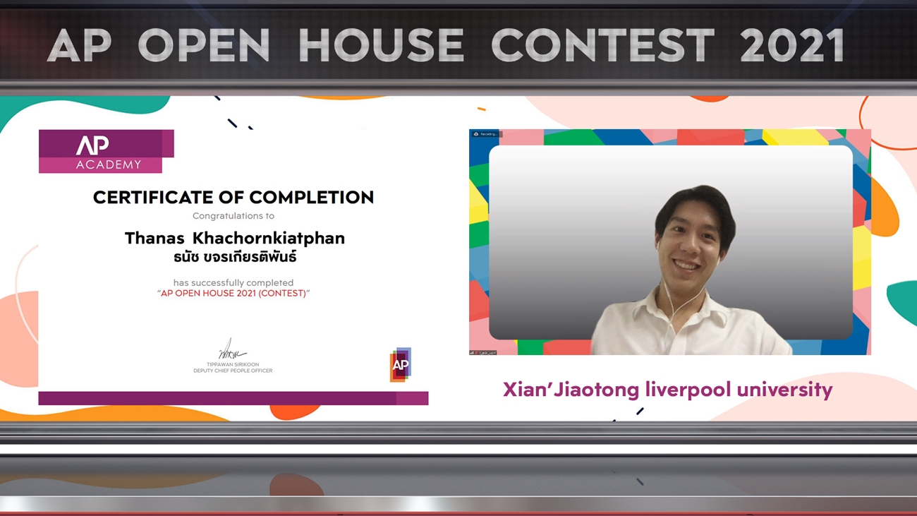 จากโจทย์ Final Project ที่ท้าทายในคอนเซ็ปต์ DESIGN FOR LIVING – ออกแบบการใช้ชีวิต รับมือยุคแห่งการเปลี่ยนแปลงภายใต้สถานการณ์โควิด-19 ให้ผู้ร่วมแข่งขันได้แสดงฝีมืออย่างเต็มที่ในการนำเสนอความคิดสร้างสรรค์ ออกแบบนวัตกรรมสินค้าและบริการ เพื่อยกระดับการใช้ชีวิต รองรับเทรนด์การอยู่อาศัยที่หลากหลาย โดยผลงาน “คุณวาน แชทบอต” คว้ารางวัลชนะเลิศอันดับ 1 ประเภทกลุ่มไปครอง และจัดมอบประกาศนียบัตร AP OPEN HOUSE CONTEST 2021 ในรูปแบบ Virtual Ceremony