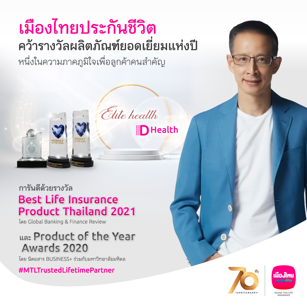 ทั้งนี้ จากกระแสการใส่ใจดูแลด้านสุขภาพของผู้บริโภคในยุคปัจจุบันรวมถึงความต้องการด้านความคุ้มครองสุขภาพที่เพิ่มขึ้น เมืองไทยประกันชีวิตจึงได้นำเสนอความคุ้มครองสุขภาพ “อีลิท เฮลท์” (Elite Health) และความคุ้มครองสุขภาพ “ดี เฮลท์” (D Health) ซึ่งเป็นสุดยอดผลิตภัณฑ์แห่งความภาคภูมิใจเพื่อลูกค้าคนสำคัญของบริษัทฯ โดดเด่นด้วยความคุ้มครองสุขภาพที่สามารถตอบโจทย์ความต้องการของลูกค้าได้อย่างตรงจุดและเลือกความคุ้มครองได้ตามไลฟ์สไตล์ อีกทั้งยังได้รับรางวัลการันตีทั้งในระดับประเทศและสากลมาครอง ตอกย้ำความโดดเด่นด้านความคุ้มครองสุขภาพ ที่พร้อมดูแลและมอบความอุ่นใจในทุกสถานการณ์ได้เป็นอย่างดี