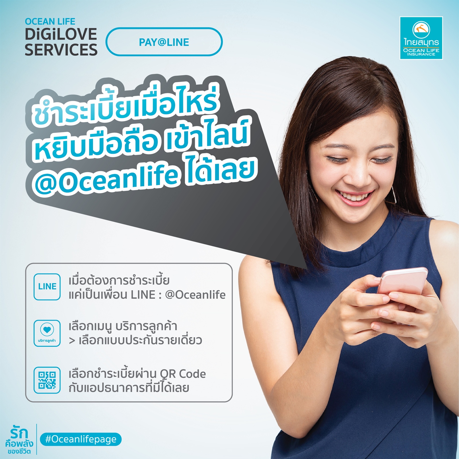 ดังนั้น จึงส่งบริการ PAY @LINE ร่วมสนับสนุนให้คนไทยก้าวสู่สังคมไร้เงินสด (Cashless Society) ด้วยบริการชำระเบี้ยประกันผ่าน QR Code เพียงเป็นเพื่อนกับเราใน LINE @Oceanlife เลือกเมนู บริการลูกค้า เพื่อเชื่อมต่อ OCEAN Connect และเลือกแบบประกันรายเดี่ยว ชำระเบี้ยประกัน ก็สามารถสแกน QR Code ชำระเบี้ยประกันผ่านแอปพลิเคชันของธนาคารที่มีได้ทันที สะดวก รวดเร็ว ให้คุณจ่ายเบี้ยประกันฯ ได้ทุกที่ทุกเวลาที่ต้องการ ช่วยลดความเสี่ยงให้กับลูกค้าและพนักงานจากการสัมผัสเงินสด