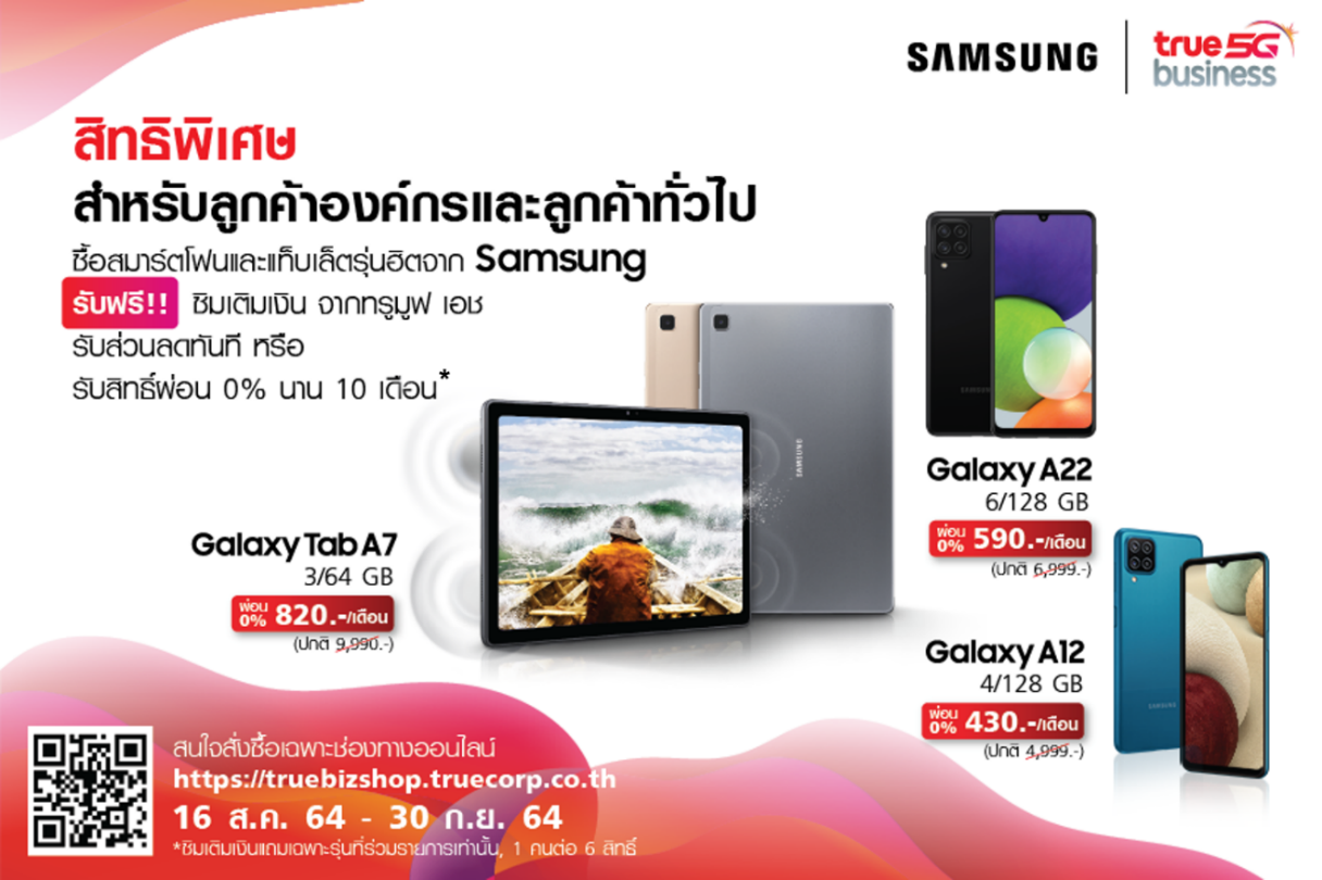 26 สิงหาคม 2564 : ซัมซุง ผู้นำด้านนวัตกรรมและเทคโนโลยีระดับโลก ร่วมมือกับ ทรู คอร์ปอเรชั่น ผู้นำการให้บริการสื่อสารและดิจิทัลแบบครบวงจรในประเทศไทย ร่วมจัดโปรโมชั่นและดีลสุดพิเศษแก่ลูกค้าธุรกิจและลูกค้าทั่วไป เมื่อซื้อมือถือสมาร์ทโฟนหรือแท็บเล็ต เครื่องเปล่า ไม่ติดสัญญาที่ร่วมรายการ รับสิทธิ์ได้ซิมประเภทเติมเงินจากทรูมูฟ เอช เล่นอินเตอร์เน็ตฟรี 4Mbps 10 GB ต่อเดือน นานสูงสุด 3 เดือนทันที