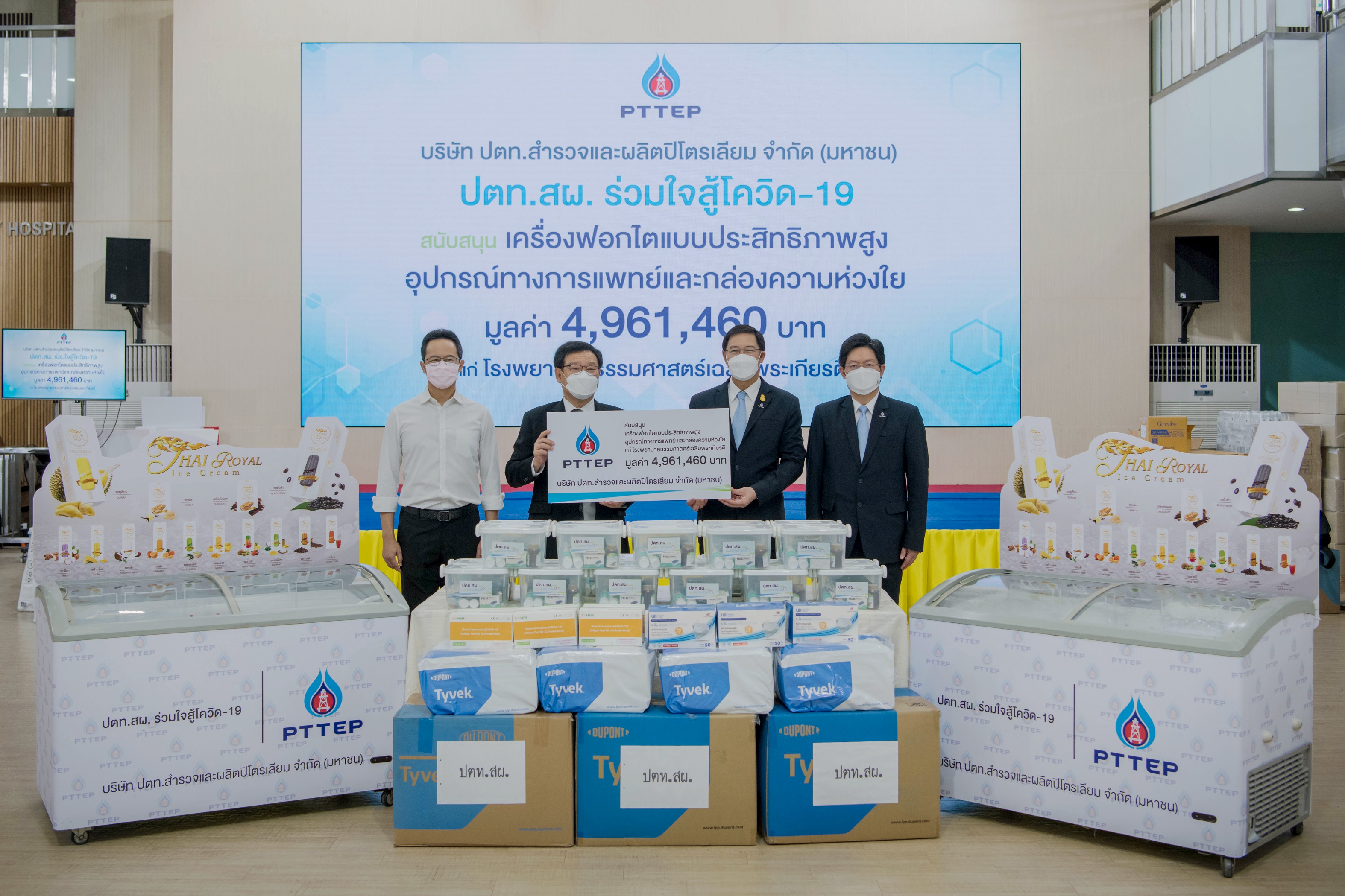 3 กันยายน 2564 : พงศธร ทวีสิน (ที่ 2 จากขวา) ประธานเจ้าหน้าที่บริหารและกรรมการผู้จัดการใหญ่ บริษัท ปตท.สำรวจและผลิตปิโตรเลียม จำกัด (มหาชน) มอบเงินสนับสนุนการจัดซื้อเครื่องฟอกไตแบบประสิทธิภาพสูง จำนวน 4 เครื่อง พร้อมทั้งมอบอุปกรณ์ทางการแพทย์ ได้แก่ หน้ากาก N95 ชุด PPE ชุดตรวจ Rapid Antigen Test Kit และกล่องความห่วงใยสำหรับผู้ป่วยโควิด-19 ที่ต้องดูแลตนเองที่บ้าน รวมมูลค่ากว่า 4,900,000 บาท ให้กับ ศ.ดร.สุรพล นิติไกรพจน์ (ที่ 2 จากซ้าย) ประธานกรรมการบริหาร โรงพยาบาลธรรมศาสตร์เฉลิมพระเกียรติ เพื่อสนับสนุนโรงพยาบาลในการดูแลและรักษาผู้ป่วยโควิด-19 ณ โรงพยาบาลธรรมศาสตร์เฉลิมพระเกียรติ จ.ปทุมธานี ![]()