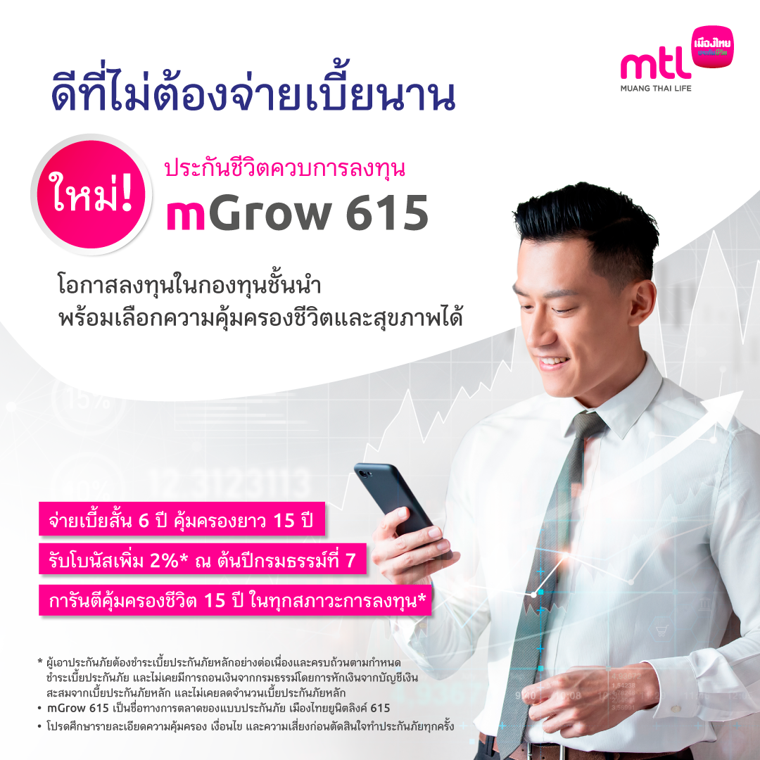 – mGrow 615 เป็นชื่อทางการตลาดของแบบประกันภัย เมืองไทยยูนิตลิงค์ 615