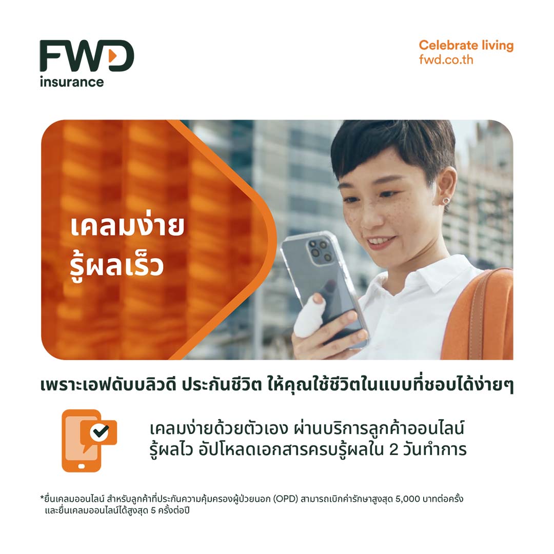 *บริการยื่นเคลมออนไลน์ สำหรับลูกค้าที่มีประกันความคุ้มครองผู้ป่วยนอก (OPD) สามารถเบิกค่ารักษาสูงสุด 5,000 บาทต่อครั้ง และยื่นเคลมออนไลน์ได้สูงสุด 5 ครั้งต่อปี - เข้าถึงข้อมูลกรมธรรม์ง่าย ได้ทั้งเว็บไซต์และแอปพลิเคชัน ลูกค้าสามารถแก้ไขจัดการกรมธรรม์ ทั้งการเปลี่ยนข้อมูล สับเปลี่ยนกองทุน ชำระเบี้ยประกัน หรือขอสิทธิ์ลดหย่อนภาษี ได้ทั้งบนเว็บไซต์ FWD Link, LINE FWD Thailand และ FWD Max mobile application
