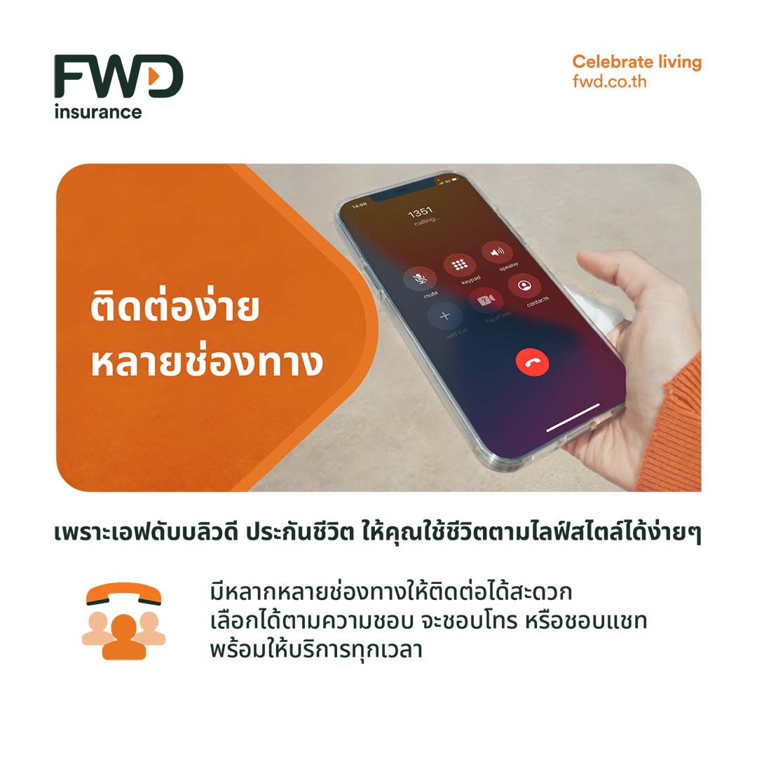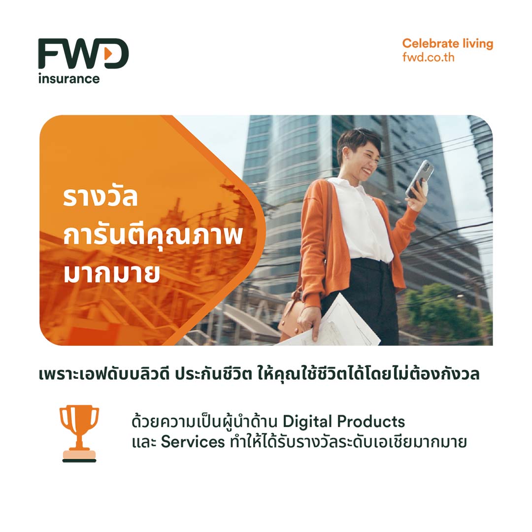 - ใช้ชีวิตตามไลฟ์สไตล์ได้ง่ายๆ สะดวกแบบไหน เราก็มีหลากหลายช่องทางให้ติดต่อ เช่น Chatbot, LINE FWD Thailand หรือ Live chat ผ่านเว็บไซต์ www.fwd.co.th ใช้ชีวิตได้อย่างมั่นใจกับ FWD การันตีด้วยความเป็นผู้นำด้าน Digital Products และ Services ได้รับรางวัลระดับเอเชียมากมาย โดยเฉพาะด้านเทคโนโลยีและนวัตกรรมทันสมัย รางวัลที่โดดเด่น อาทิ 2564 ASIA’S MOST INNOVATIVE INSURER Awards จาก IDC FIIA Award 2563 Product Innovation Awards ประเภทรางวัลสุดยอดสินค้าและบริการยอดเยี่ยมในปี