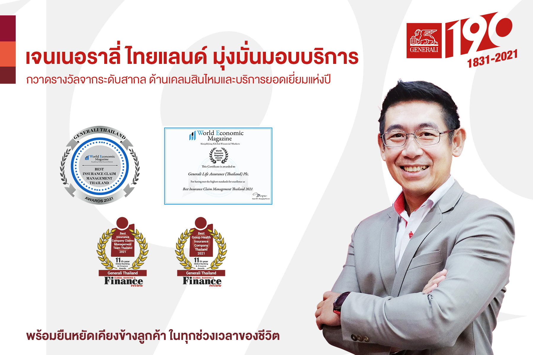 สำหรับรางวัลแรกคือ "Best Insurance Claim Management Thailand 2021” ความเป็นเลิศในการให้บริการด้านสินไหมทดแทน โดยตลอดระยะเวลาที่ผ่านมา เจนเนอราลี่ ประเทศไทย ได้มุ่งมั่นพัฒนาระบบจัดการการให้บริการสินไหมที่รวดเร็วมาอย่างต่อเนื่อง เพื่อให้ลูกค้าได้รับความสะดวกสบายในการใช้บริการ ทั้งการจัดการให้บริการสินไหมที่สะดวกสบายโดยไม่ต้องสำรองจ่าย ด้านเครือข่ายสถานพยาบาลที่ครอบคลุมมากกว่า 500 แห่ง