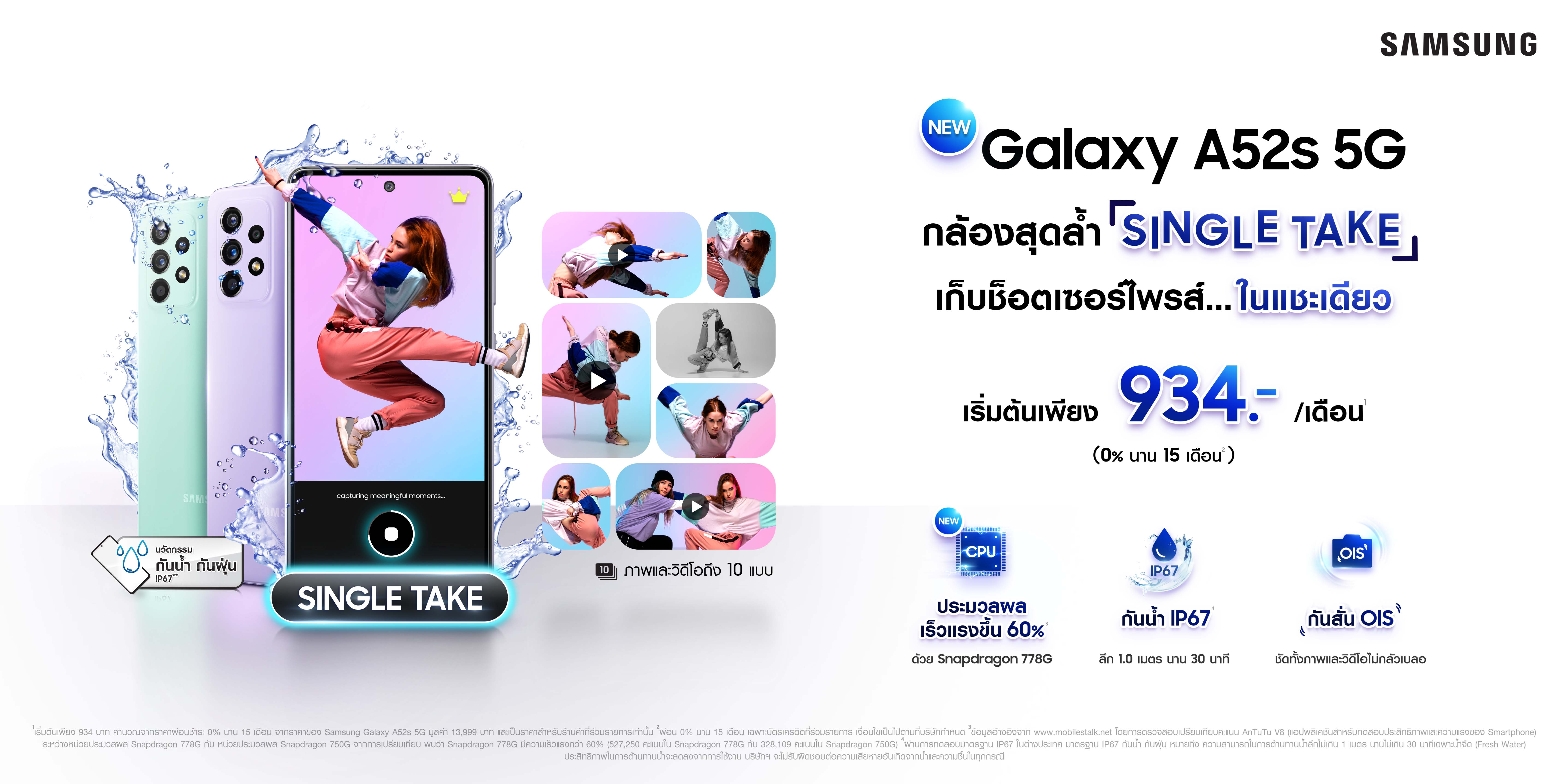 8 กันยายน 2564 : เปิดตัวสมาชิกใหม่ล่าสุด Samsung Galaxy A52s 5G สมาร์ทโฟนที่ตอบโจทย์ทุกมิติของการทำคอนเทนต์อย่างแท้จริง นำโดยฟีเจอร์กล้องสุดล้ำอย่าง Single Take ที่สามารถเก็บครบทุกโมเมนต์พิเศษได้ในช็อตเดียว พร้อมอัดแน่นเทคโนโลยีระดับพรีเมียมมากมาย ทั้งชิปเซ็ตใหม่ที่เร็วแรงกว่าเดิมถึง 60%[1] ไปจนถึงประสิทธิภาพการกันน้ำและฝุ่น รวมถึงความสามารถอื่นๆ อีกมากมายที่ตอบรับ Insights ของผู้ใช้ Gen Z เรียกได้ว่า จบ ครบ ในเครื่องเดียว การันตีความคุ้มค่าที่สุดในตลาดสมาร์ทโฟนระดับราคา 13,999 บาท โดยมาพร้อมดีลพิเศษ กับราคาเริ่มต้นเพียง 934 บาทต่อเดือนเท่านั้น![2]