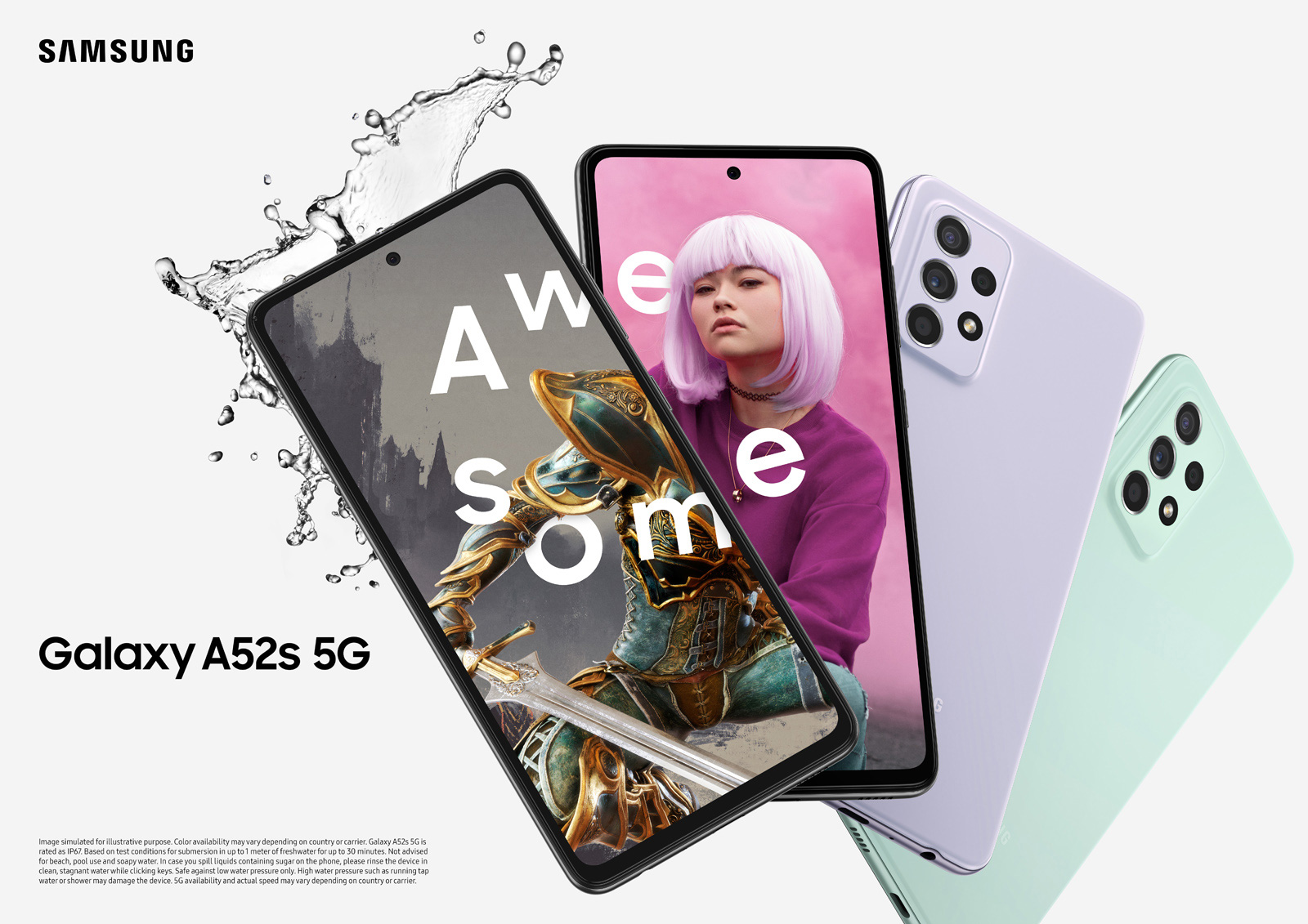 เมื่อต้นปีที่ผ่านมา ซัมซุงได้สร้างมาตรฐานใหม่ให้กับตลาดสมาร์ทโฟนระดับกลางด้วยการนำเสนอคุณสมบัติกันน้ำและฝุ่นเป็นครั้งแรกในรุ่น Galaxy A72 และ A52 ซึ่งเป็นฟังก์ชันที่ผู้บริโภคส่วนใหญ่ต้องการ เช่นเดียวกับ Galaxy A52s 5G รุ่นใหม่นี้ ที่มาพร้อมประสิทธิภาพกันน้ำและฝุ่นระดับ IP67[7] จึงใช้งานได้อย่างอุ่นใจ หมดกังวลหากน้ำหกใส่หรือจำเป็นต้องใช้ขณะฝนตก