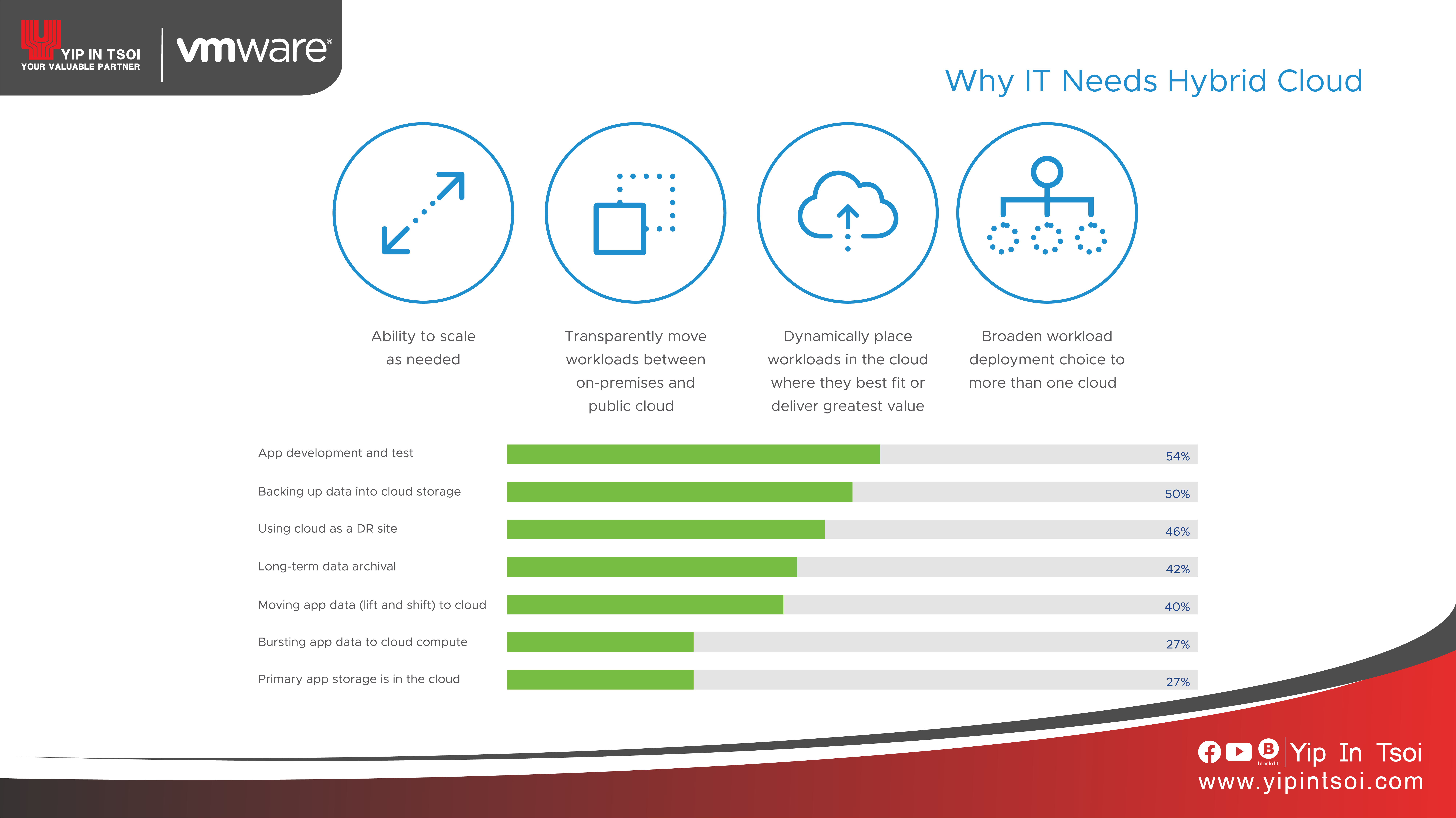 หากระบบใดมีความสำคัญก็สามารถนำข้อมูลเก็บไว้ที่ระบบ On-premise ได้ และหากมี Workload อื่นที่สามารถนำไปใช้งานหรือเก็บบน Public cloud ได้ เช่น Dev Workload หรือ Modernize application ที่ Develop ด้วย new technology ในรูปแบบของ micro service ที่จะโยกงานไปอยู่บน public cloud ให้รองรับการขยายตัวแบบ scale-out ได้อย่างต่อเนื่องหรือลดลงในกรณีที่มีการใช้งานที่น้อยลง