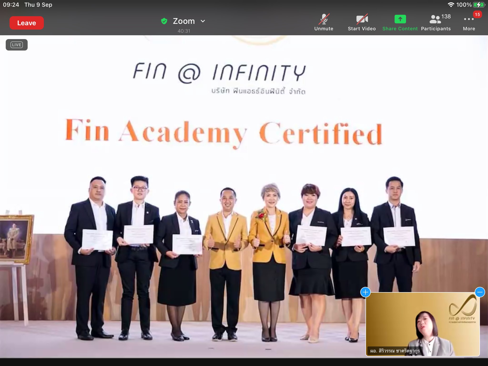 9 กันยายน 2564 : บริษัท ฟินน์แอธธ์อินฟินิตี้ จำกัด (FIN@Infinity) บริษัทที่ปรึกษาการเงินขนาดใหญ่ย่านเมืองทองธานี เปิดตัวหลักสูตรพัฒนาตัวแทนประกันชีวิต FIN Academy ให้ทำงานอย่างมืออาชีพและเป็นระบบ พร้อมก้าวเข้าสู่การเป็นที่ปรึกษาการเงินแบบครบวงจรเต็มรูปแบบ รองรับโลกการเงินยุคใหม่ในอนาคต ขณะนี้มีตัวแทนที่จบหลักสูตรแล้ว 10 คน คาดว่าในปีนี้จะเพิ่มขึ้นเป็น 20 คน เนื่องจากสถานการณ์โควิด จึงทำให้ต้องชะลอการฝึกอบรม