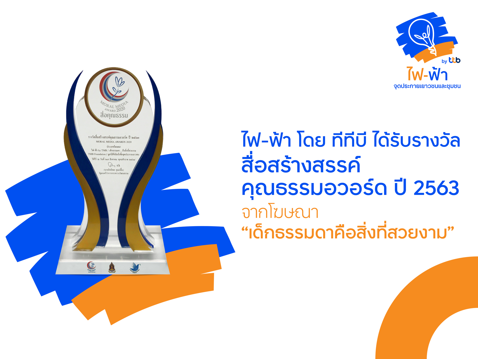 22 กันยายน 2564 : ไฟ-ฟ้าโดย ทีทีบี ได้รับรางวัล สื่อสร้างสรรค์คุณธรรมอวอร์ด ปี 2563 (Moral Media Awards 2020) จากภาพยนตร์โฆษณาออนไลน์เรื่อง “เด็กธรรมดา…คือสิ่งที่สวยงาม”ซึ่งเป็นการถ่ายทอดเรื่องราวของเด็กๆ ในชุมชนที่อาจจะเริ่มต้นด้วยต้นทุนชีวิตที่ติดลบ
