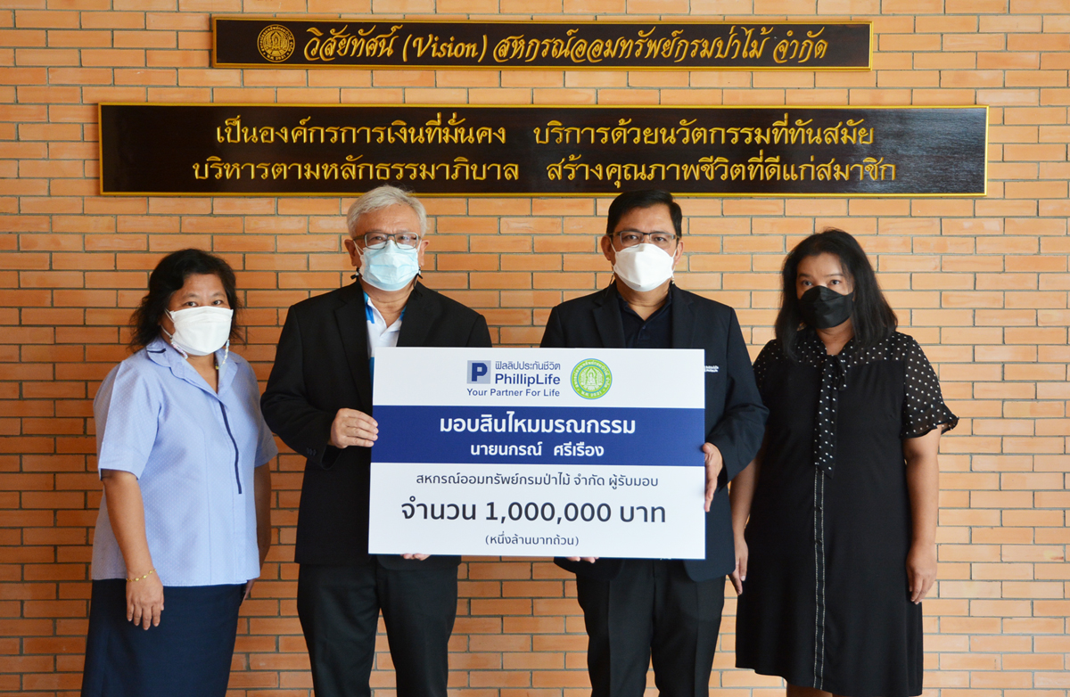 23 กันยายน 2564 : ปรีชา ไพบูลย์วุฒิโชค ผู้ช่วยกรรมการผู้จัดการอาวุโสและรักษาการผู้ช่วยกรรมการผู้จัดการอาวุโสฝ่ายขาย บริษัท ฟิลลิปประกันชีวิต จำกัด (มหาชน) มอบเงินสินไหมมรณกรรมประกันชีวิตกลุ่ม นายนกรณ์ ศรีเรือง จำนวน 1,000,000 บาท (หนึ่งล้านบาทถ้วน) ผู้ประสบเหตุกระทิงป่าขวิดเสียชีวิตขณะปฏิบัติหน้าที่ โดยมี ธนโรจน์ โพธิสาโร ในฐานะรองประธานกรรมการ สหกรณ์ออมทรัพย์กรมป่าไม้ จำกัด เป็นผู้รับมอบฯ ณ สหกรณ์ออมทรัพย์กรมป่าไม้ กรุงเทพฯ ![]()
