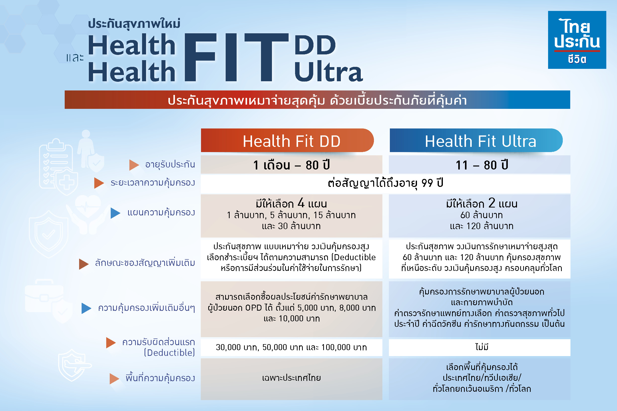 ไทยประกันชีวิตจึงได้พัฒนาสัญญาเพิ่มเติมประกันสุขภาพแบบเหมาจ่าย 2 แบบ ประกอบด้วย สัญญาเพิ่มเติม ประกันสุขภาพ Health Fit DD เหมาะสำหรับกลุ่มคนวัยทำงาน หรือผู้ที่มีสวัสดิการค่ารักษาพยาบาลอยู่แล้ว แต่ต้องการทำประกันสุขภาพเพิ่ม เพื่อยกระดับคุณภาพการรักษาและวงเงินความคุ้มครองสูงขึ้น ด้วยเบี้ยประกันภัยที่คุ้มค่า โดยมีแผนประกันให้เลือก 4 แผน ตั้งแต่ 1 ล้านบาท, 5 ล้านบาท, 15 ล้านบาท และสูงสุด 30 ล้านบาท ซึ่งให้ความคุ้มครองทั้งกรณีผู้ป่วยใน (IPD) และผู้ป่วยนอก (OPD)