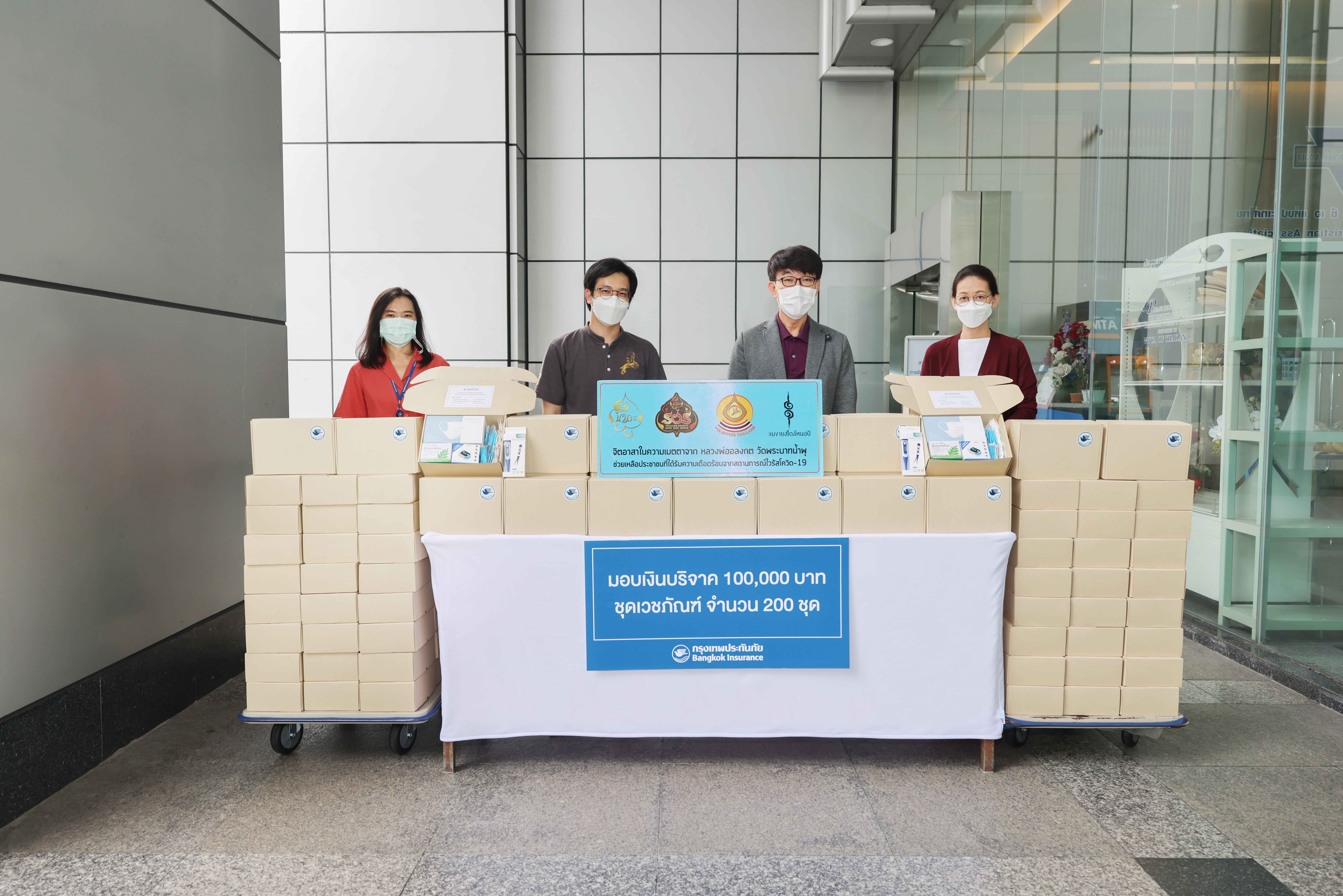 28 กันยายน 2564 : บริษัท กรุงเทพประกันภัย จำกัด (มหาชน) หรือ BKI โดย ดร.อภิสิทธิ์ อนันตนาถรัตน ประธานคณะผู้บริหารและกรรมการผู้อำนวยการใหญ่ (ที่ 2 จากขวา) มอบเงินบริจาคจำนวน 100,000 บาท และชุดเวชภัณฑ์สำหรับดูแลสุขภาพ จำนวน 200 ชุด ประกอบด้วย เครื่องวัดระดับออกซิเจน ปรอทวัดไข้ หน้ากากอนามัย ฟ้าทะลายโจร ยาพาราเชตามอล และยาละลายเสมหะ ให้แก่ วัดพระบาทน้ำพุซึ่งได้จัดตั้งโรงพยาบาลสนามธรรมรักษ์ วัดพระบาทน้ำพุ จังหวัดลพบุรี เพื่อรักษาผู้ป่วย ที่ติดเชื้อโควิด-19 โดยมีนายเสกสันน์ ทรัพย์สืบสกุล (ที่ 2 จากซ้าย) จิตอาสาในความเมตตาจาก หลวงพ่ออลงกต วัดพระบาทน้ำพุ เป็นผู้แทนรับมอบ ณ อาคารกรุงเทพประกันภัย เมื่อวันที่ 14 กันยายน 2564 ที่ผ่านมา