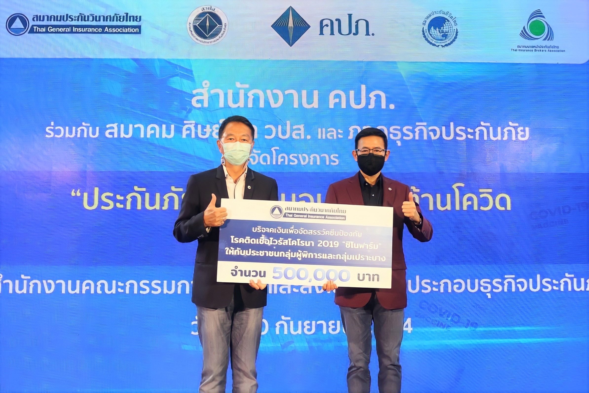 30 กันยายน 2564 : ดร.สุทธิพล ทวีชัยการ เลขาธิการ คปภ. รับมอบเงินจำนวน 500,000 บาท จาก อานนท์ วังวสุ นายกสมาคมประกันวินาศภัยไทย เพื่อจัดสรรวัคซีนป้องกันโรคติดเชื้อไวรัสโคโรนา 2019 ซิโนฟาร์ม ให้กับประชาชนกลุ่มผู้พิการและกลุ่มเปราะบาง ในโครงการความร่วมมือ “ประกันภัยรวมใจมอบวัคซีนต้านโควิดสู่ประชาชน” ณ ห้องประชุมสถาบันวิทยาการประกันภัย สำนักงาน คปภ. ![]()