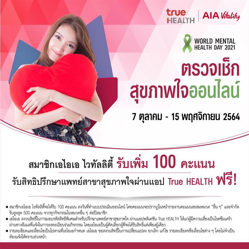 รวมถึงสมาชิกเอไอเอ ไวทัลลิตี้ ในการทำแบบประเมินความเครียดและภาวะซึมเศร้า เพื่อตรวจสอบความแข็งแรงของสุขภาพใจ สำหรับลูกค้าท่านใดที่มีผลการทดสอบที่แสดงว่ามีภาวะเสี่ยงเป็นโรคซึมเศร้า เอไอเอจะมอบโค้ด (Code)[3] เพื่อนำไปลงทะเบียน พร้อมพูดคุยและรับคำปรึกษาจากแพทย์ผู้เชี่ยวชาญ ฟรี ผ่านทางแอปพลิเคชัน ทรู เฮลท์ (True HEALTH) โดยบริการพิเศษนี้ จัดขึ้นเนื่องในวันสุขภาพจิตโลก ซึ่งเป็นการผสานความร่วมมือในการนำเทคโนโลยีเข้ามาเป็นส่วนหนึ่งในการดูแลสุขภาพ มุ่งตอบโจทย์ไลฟ์สไตล์ลูกค้ายุคดิจิทัลด้วยการยกระดับประสบการณ์ด้านสุขภาพแก่ลูกค้าเอไอเอ”