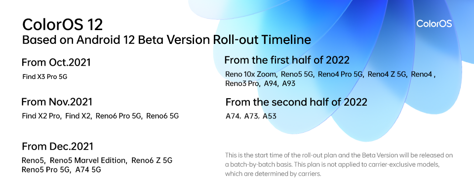 OPPO จะเปิดตัว ColorOS 12 รุ่น public beta ในอินโดนีเซีย ไทย และมาเลเซียบน OPPO Find X3 Pro 5G จากนั้นจะเปิดตัวในประเทศอื่นๆ เพิ่มเติมต่อไปตามแผนการในปี 2564 และ 2565 โดย OPPO ตั้งเป้าในการนำColorOS 12 ให้ผู้ใช้งาน 150 ล้านคน บนกว่า 110 รุ่น นโยบายการอัปเกรด เอ็กซ์คลูซีฟเฉพาะ OPPO ถือเป็นครั้งแรกที่ OPPO มีการประกาศนโยบายการอัปเกรดครั้งสำคัญ โดยเฉพาะรุ่นที่วางจำหน่ายตั้งแต่ปี 2562 เป็นต้นไป