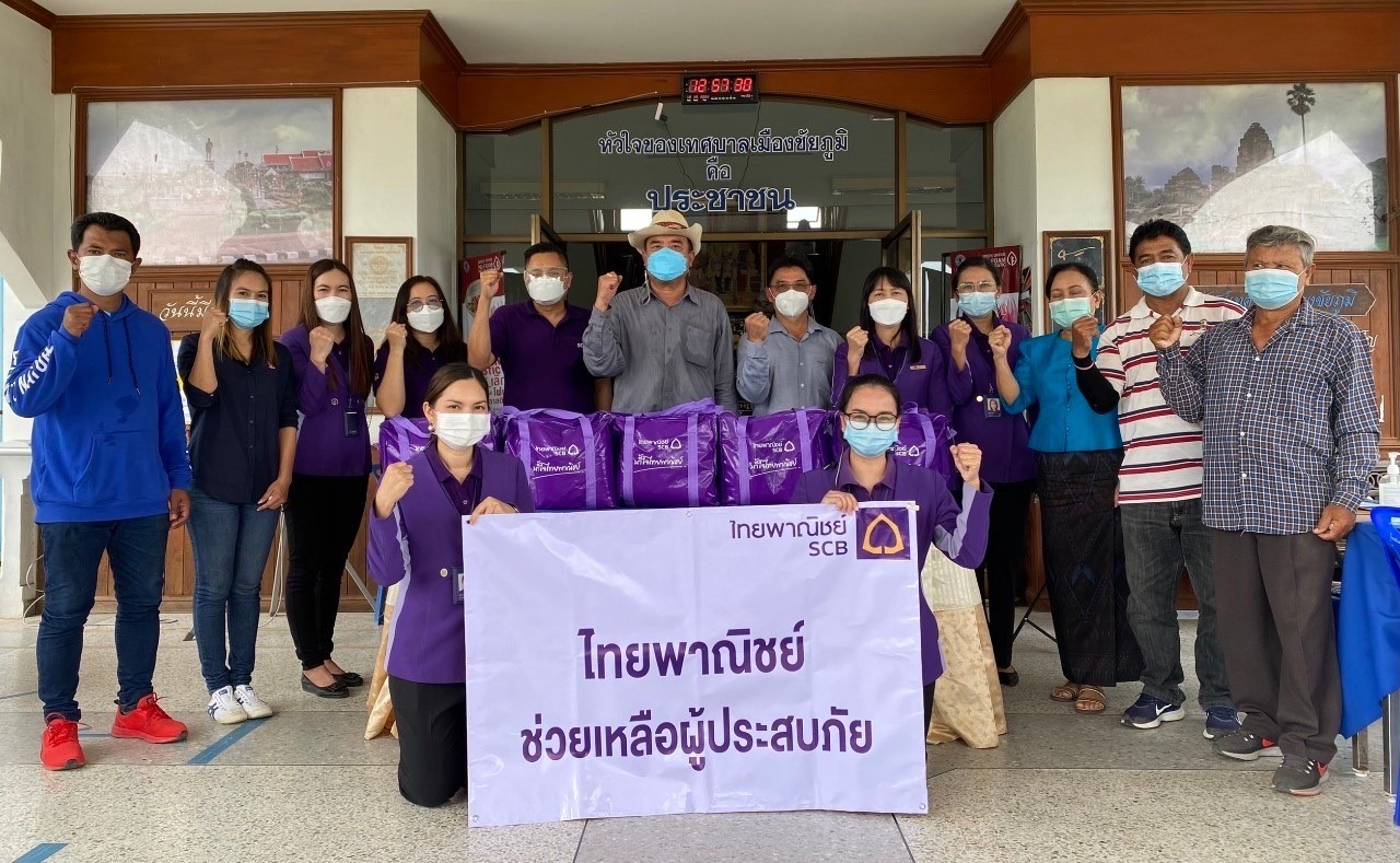 นายปรัชญา สังขจันทร์ ผู้อำนวยการเขตพื้นที่ขอนแก่น ธนาคารไทยพาณิชย์ พร้อมพนักงานธนาคารฯ ในพื้นที่ มอบถุงยังชีพให้แก่นายคุณานนต์ หินเธาว์ นายกเทศมนตรีตำบลชนบท จังหวัดขอนแก่น และส่งมอบให้แก่นายธีวรา วิตนากร นายกเทศมนตรีเมืองชัยภูมิ จังหวัดชัยภูมิ และนายวรศิษย์ พุฒจีบ นายอำเภอจัตุรัส จังหวัดชัยภูมิ เพื่อนำไปช่วยเหลือประชาชนที่ได้รับผลกระทบจากเหตุอุทกภัยที่เกิดขึ้น โดยถุงยังชีพทั้งหมดนี้ พนักงานจิตอาสา “SCB ชวนกันทำดี” ทั้งที่สำนักงานใหญ่และสาขาในเขตพื้นที่ที่ประสบอุทกภัยได้ร่วมแรงร่วมใจกันจัดเตรียมขึ้นเพื่อเป็นกำลังใจให้พี่น้องประชาชนที่ประสบอุทกภัยผ่านช่วงเวลาที่ยากลำบากนี้ไปโดยเร็ว”