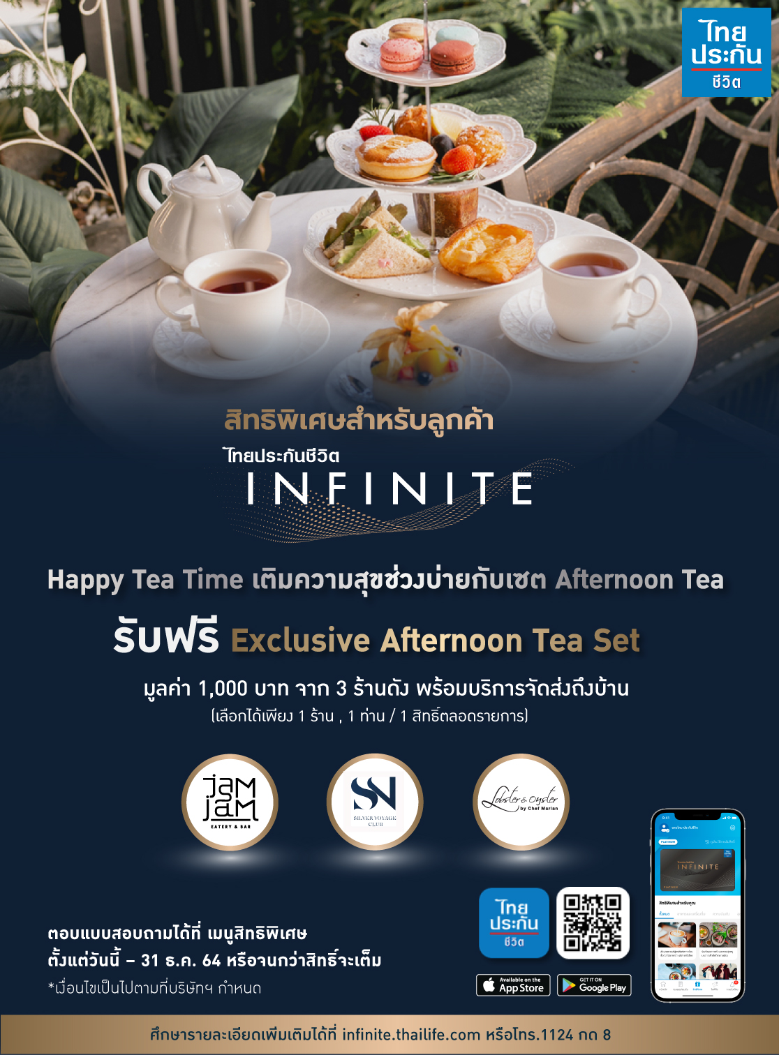 ในช่วงส่งท้ายปี 2564 บริษัทฯ จึงได้จัดแคมเปญ “Happy Tea Time เติมความสุขช่วงบ่ายกับเซต Afternoon Tea” เพื่อมอบความสุขถึงบ้าน สำหรับผู้เอาประกันภัยที่เป็นสมาชิกไทยประกันชีวิต INFINITE ทุกระดับ ในพื้นที่กรุงเทพฯ, นนทบุรี, ปทุมธานี และสมุทรปราการ โดยมอบชุด Afternoon Tea Set มูลค่า 1,000บาท จากร้านอาหารชั้นนำ พร้อมบริการจัดส่งระดับพรีเมียม ตั้งแต่วันนี้ – 31 ธันวาคม 2564 หรือจนกว่าสิทธิ์จะครบตามจำนวนที่กำหนด