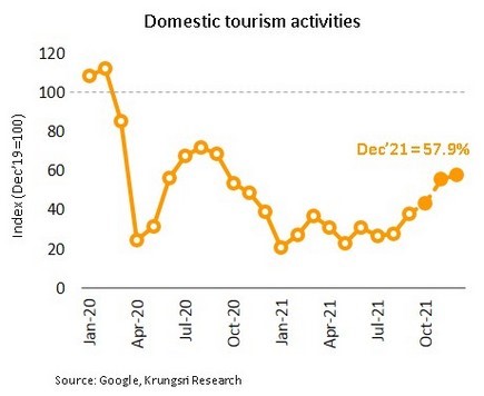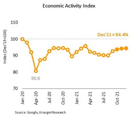 วิจัยกรุงศรีประเมินแม้จะมีการผ่อนคลายมาตรการควบคุมการระบาดเพิ่มเติม และมีการเปิดประเทศรับนักท่องเที่ยวต่างชาติแบบไม่กักตัว แต่คาดว่ากิจกรรมทางเศรษฐกิจโดยรวมภายในสิ้นปีนี้จะยังอยู่ในระดับต่ำกว่าช่วงก่อนเกิดวิกฤต COVID-19 อยู่ประมาณ 6% โดยคำนวณจากการใช้ข้อมูลความถี่เร็ว ได้แก่ ความเข้มงวดของมาตรการ (measures of stringency) ความเข้มงวดของมาตรการที่เกิดขึ้นจริง (Implied stringency)