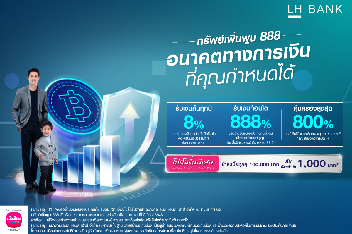 19 ตุลาคม 2564 : นายวุฒิชัย กมลสันติสุข ผู้ช่วยกรรมการผู้จัดการ Retail Product and Marketing ธนาคารแลนด์ แอนด์ เฮ้าส์ จำกัด (มหาชน) เปิดเผยว่า ธนาคารได้พัฒนาและสร้างสรรค์ผลิตภัณฑ์แบบประกันชีวิตแบบสะสมทรัพย์ร่วมกับ บมจ. เมืองไทยประกันชีวิต คือ ทรัพย์เพิ่มพูน 888 นับเป็นแบบประกันชีวิตที่ให้ผลตอบแทนที่สูงถึงปีละ 8% ของจำนวนเงินเอาประกันภัยเริ่มต้น ตั้งแต่สิ้นปีกรมธรรม์ที่ 1 ถึงอายุครบ 87 ปี พร้อมทั้งอีกจุดเด่นคือ แบบประกันนี้มีเงินคืนแน่นอน ด้วยเงินก้อนสูงถึง 888% ของจำนวนเงินเอาประกันภัยเริ่มต้น เมื่อครบกำหนดสัญญา ณ สิ้นปีกรมธรรม์ ที่อายุครบ 88 ปี