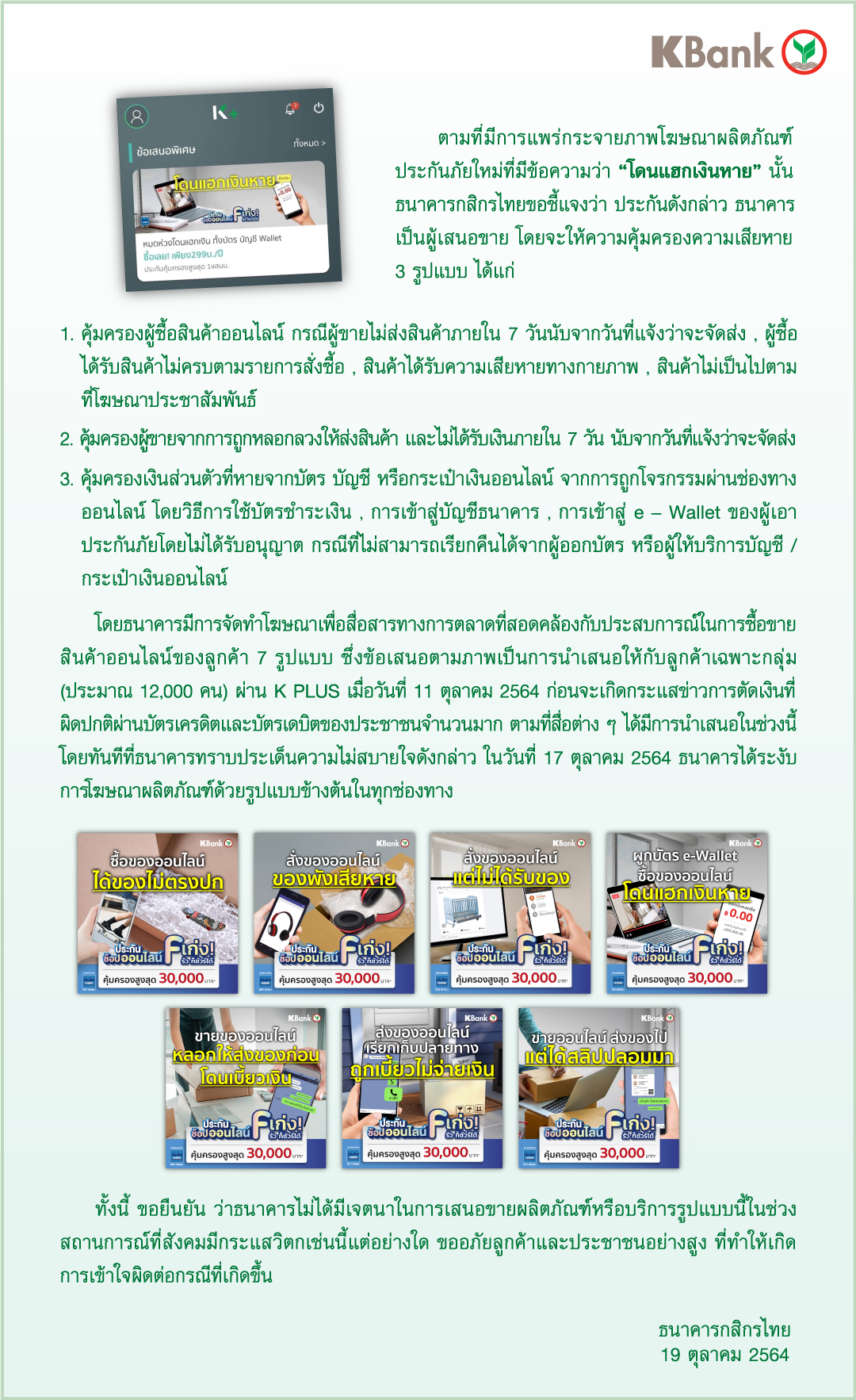 19 ตุลาคม 2564 : ตามที่มีการแพร่กระจายภาพโฆษณาผลิตภัณฑ์ประกันภัยใหม่ ที่มีข้อความว่า “โดนแฮกเงินหาย” นั้น ธนาคารกสิกไทย ขอชี้แจงว่า ประกันดังกล่าวธนาคารเป็นผู้เสนอขาย โดยจะให้ความคุ้มครองความเสียหาย 3 รูปแบบ ได้แก่