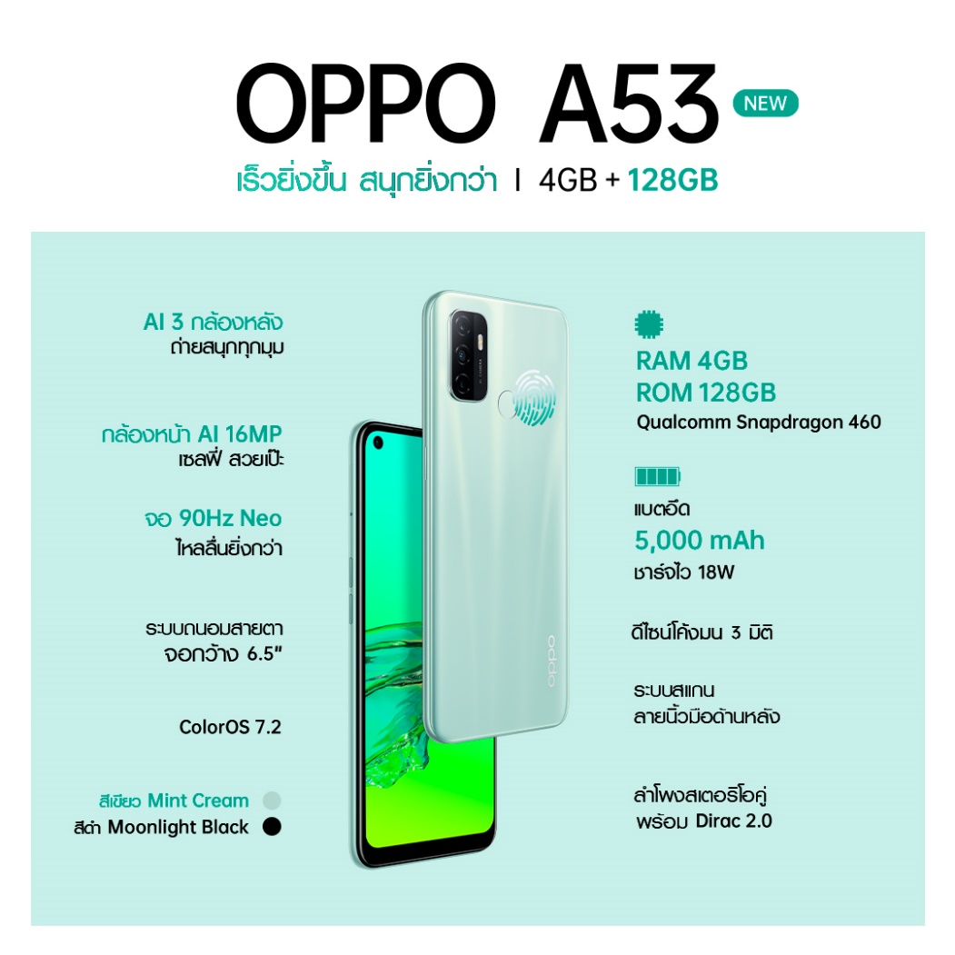 พบกับความเร็วแรงที่มากขึ้นและสนุกได้มากกว่าที่เคยกับ OPPO A53 NEW รุ่น RAM 4GB, ROM 128GB ใหม่ ได้ตั้งแต่วันที่ 22 ตุลาคม 2564 โดยมี 2 สีสันสดใสให้เลือก คือ สีเขียว Mint Cream และสีดำ Moonlight Black มาในราคาเพียง 6,499 บาท ที่ OPPO Brand Shop ทุกสาขา และตัวแทนจำหน่ายทั่วประเทศ ![]()