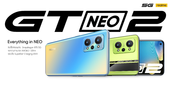 ล่าสุด “realme GT Neo2 5G” พร้อมจัดเต็มกับซิปเซ็ตทรงพลัง Snapdragon 870 5G มอบประสิทธิภาพการทำงานขั้นสุด ลื่นไหลไม่มีสะดุดทุกฟีเจอร์ รองรับเกมกราฟิกหนักๆ ได้แบบสบายๆ พร้อมจอแสดงผล E4 AMOLED ให้คุณเสพคอนเทนต์อย่างเต็มขั้นทุกรูปแบบ และรองรับระบบ SuperDart Charging เร็วสุด 65W สามารถใช้งานได้ตลอดวันและชาร์จได้รวดเร็วทันใจ และยังมอบดีไซน์หรูหราที่จะสะกดทุกสายตาด้วยโทนสีเขียวสดใส Neo Green เพื่อสื่อถึงความล้ำหน้าทางเทคโนโลยีและพลังชีวิตอันเปี่ยมล้นของคนรุ่นใหม่
