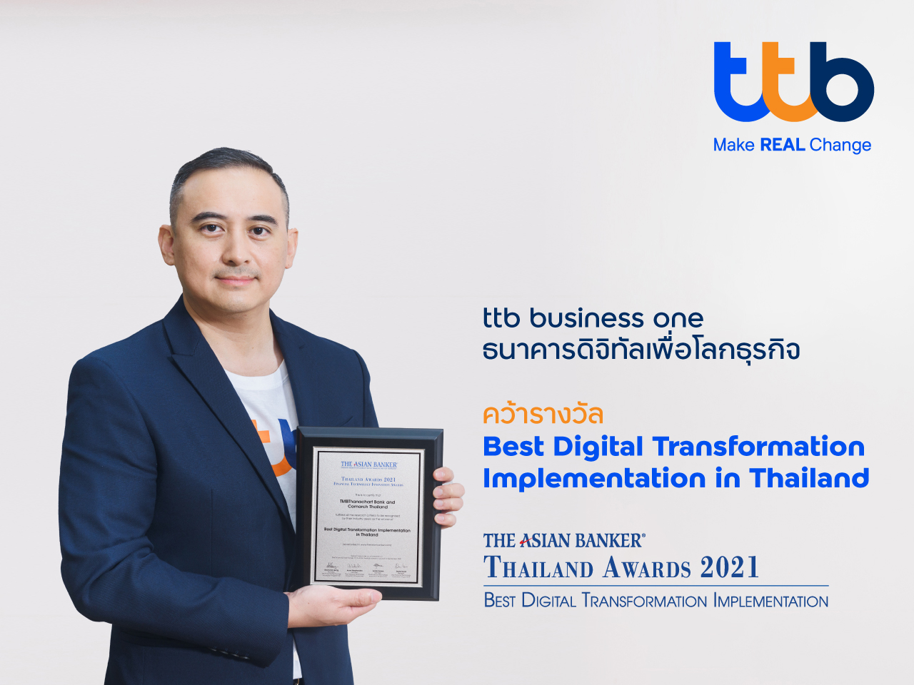 26 ตุลาคม 2564 : ทีทีบี บิสสิเนสวัน (ttb business one) ธนาคารดิจิทัลเพื่อโลกธุรกิจ คว้ารางวัล Best Digital Transformation Implementation in Thailand ประเภท Financial Technology & Innovation Awards in Thailand จากเวที The Asian Banker Thailand Awards 2021 นิตยสารชั้นนำด้านการเงินการธนาคารในภูมิภาคเอเชีย