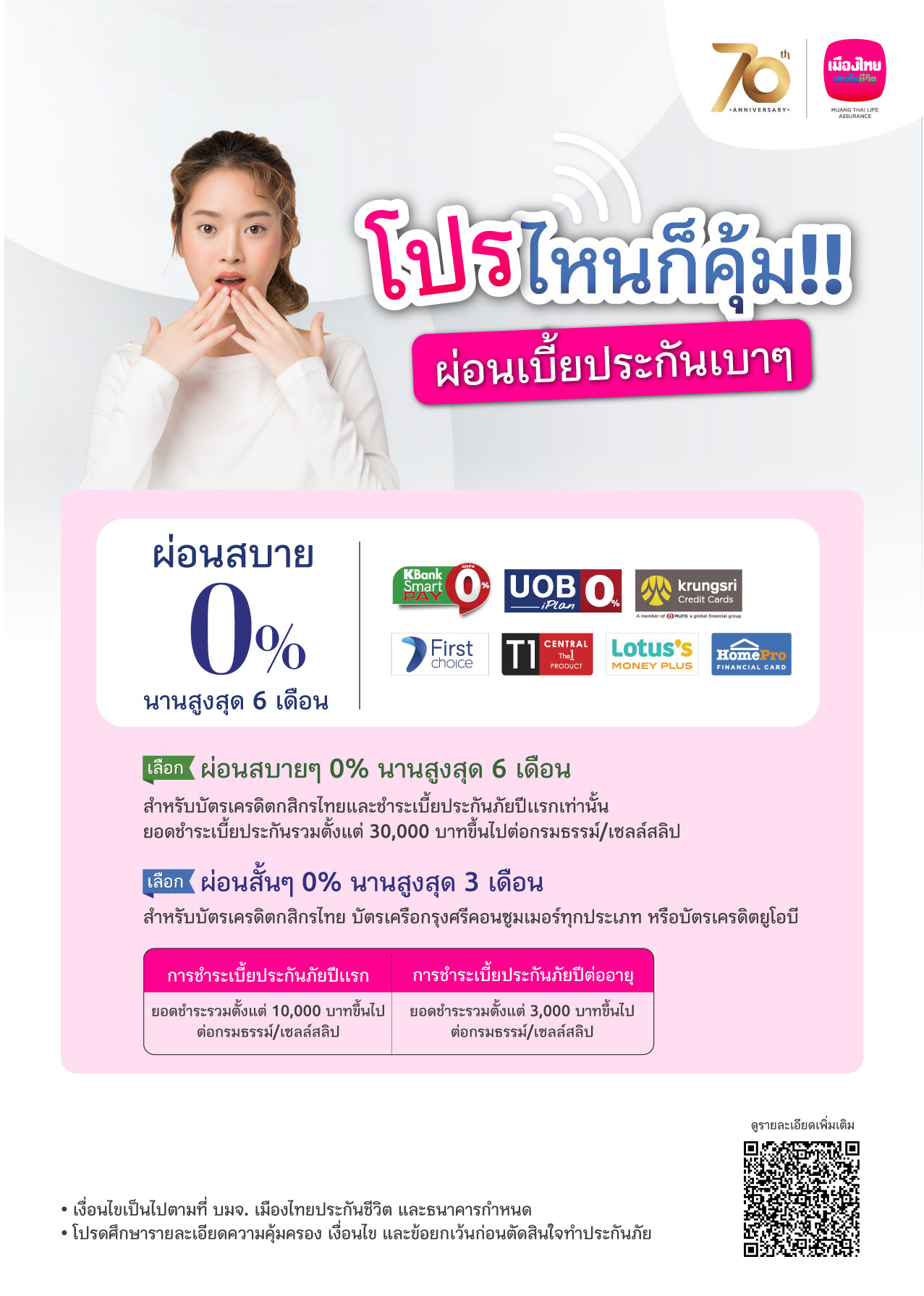 หมายเหตุ : – เงื่อนไขเป็นไปตามที่ บมจ.เมืองไทยประกันชีวิต และธนาคารกำหนด