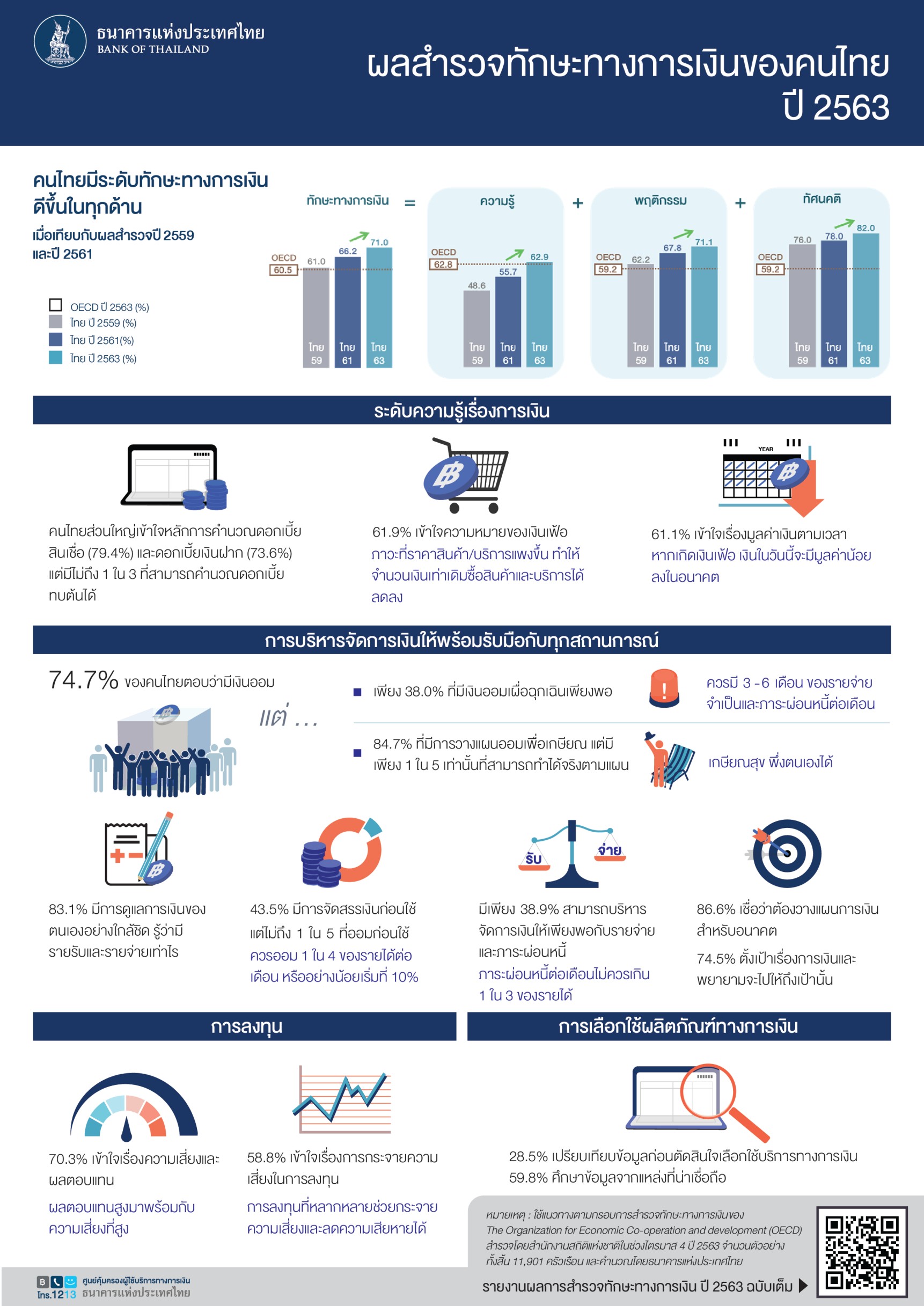 ผลการสำรวจทักษะทางการเงิน 1 ปี 2563 แสดงให้เห็นว่า คนไทยมีพัฒนาการระดับทักษะทางการเงินดีขึ้นอยู่ที่ร้อยละ 71.0 สูงกว่าการสำรวจครั้งก่อนในปี 2561 (ร้อยละ 66.2) และสูงกว่าค่าเฉลี่ยการสำรวจทักษะทางการเงินครั้งล่าสุดของ OECD ในปี 2563 2 (ร้อยละ 60.5) เมื่อพิจารณาองค์ประกอบของทักษะทางการเงินทั้ง 3 ด้าน พบว่าคนไทยมีพัฒนาการดีขึ้นในทุกด้าน โดยความรู้ทางการเงินอยู่ที่ร้อยละ 62.9 (ร้อยละ 55.7 ในปี 2561)ปรับตัวดีขึ้น ในทุกหัวข้อ แต่ยังมีหัวข้อที่สามารถพัฒนาและส่งเสริมเพิ่มเติม ได้แก่