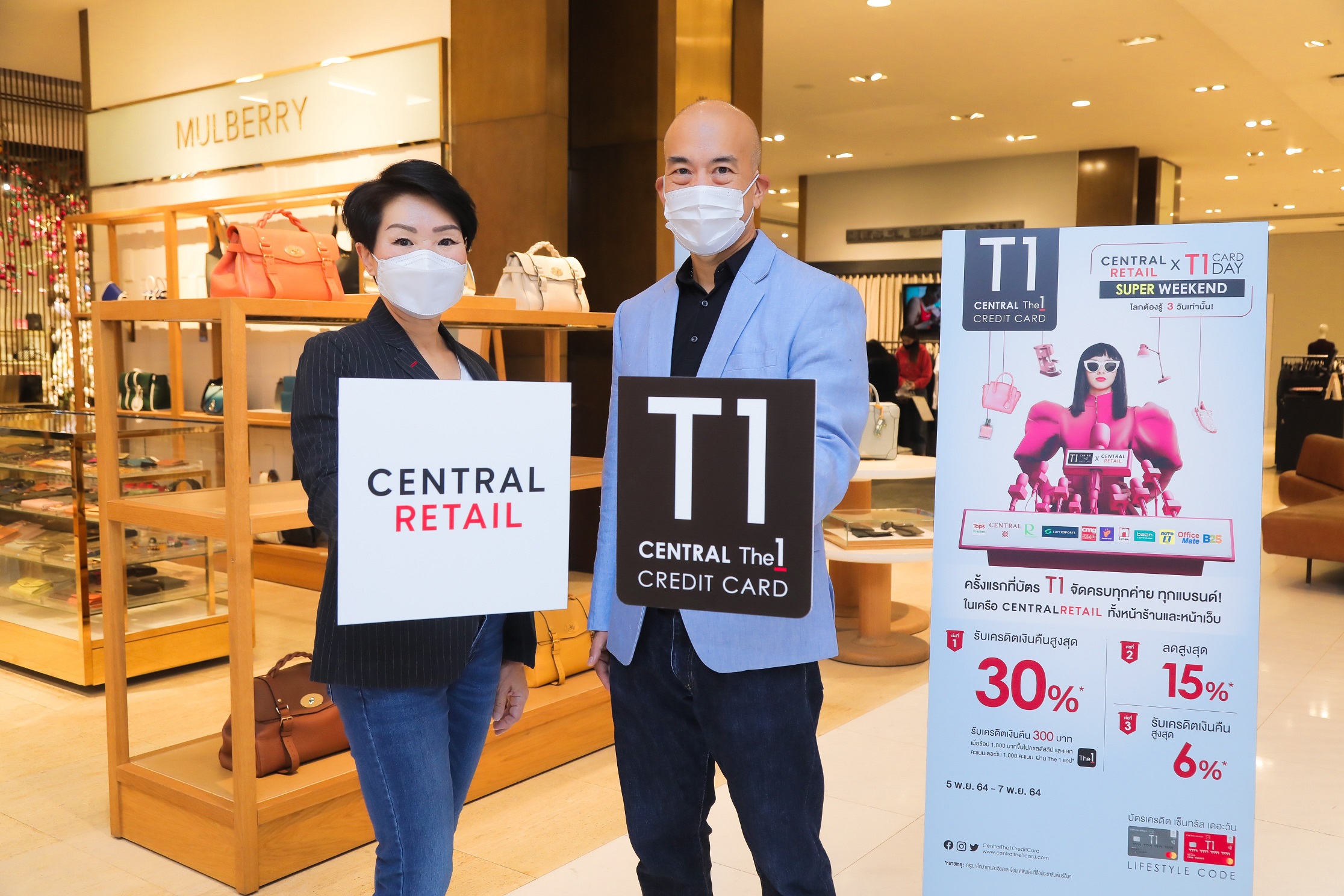 กรุงเทพฯ, 3 พฤศจิกายน 2564 : อธิศ รุจิรวัฒน์ (ขวา) กรรมการผู้จัดการ บริษัท เจเนอรัล คาร์ด เซอร์วิสเซส จำกัด ร่วมกับ ปิยวรรณ ลีละสมภพ (ซ้าย) รองกรรมการผู้จัดการใหญ่ฝ่ายการตลาด บริษัท เซ็นทรัล รีเทล คอร์ปอเรชั่น จำกัด (มหาชน) ขนทัพแบรนด์ดังลดจัดหนักทั้งเครือเซ็นทรัล รีเทล ขอบคุณลูกค้าคนสำคัญกับโปรแรงแห่งปี “Central Retail X T1 Card Day Super Weekend” 5 – 7 พฤศจิกายนนี้ ชวนช้อป 3 วันสุดพิเศษ กับดีลสุดเอ็กซ์คลูซีฟเฉพาะสมาชิกบัตรเครดิต เซ็นทรัล เดอะวัน ทุกหน้าบัตร กับสิทธิพิเศษ 3 ต่อ