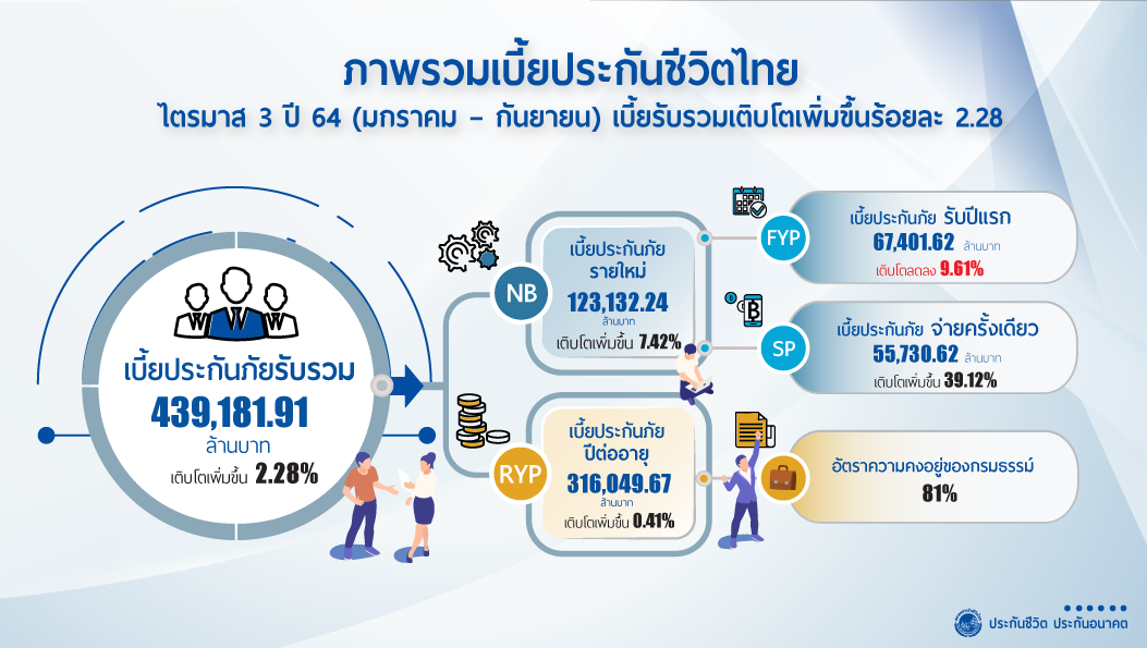 4 พฤศจิกายน 2564 : นายสาระ ล่ำซำ นายกสมาคมประกันชีวิตไทย เปิดเผยว่า ไตรมาส 3 ปี 2564 (มกราคม – กันยายน ) ธุรกิจประกันชีวิตมีผลงานเบี้ยประกันภัยรับรวมทั้งสิ้น 439,181.91 ล้านบาท คิดเป็นอัตราการเติบโตเพิ่มขึ้นร้อยละ 2.28 เมื่อเทียบกับระยะเวลาเดียวกันในปีที่ผ่านมา จำแนกเป็นเบี้ยประกันภัยรับรายใหม่ จำนวน 123,132.24 ล้านบาทด้วยอัตราเติบโตเพิ่มขึ้นร้อยละ 7.42 และเบี้ยประกันภัยรับปีต่อไปจำนวน 316,049.67 ล้านบาทด้วยอัตราเติบโตเพิ่มขึ้นร้อยละ 0.41 และมีอัตราความคงอยู่ของกรมธรรม์ประกันชีวิตร้อยละ 81