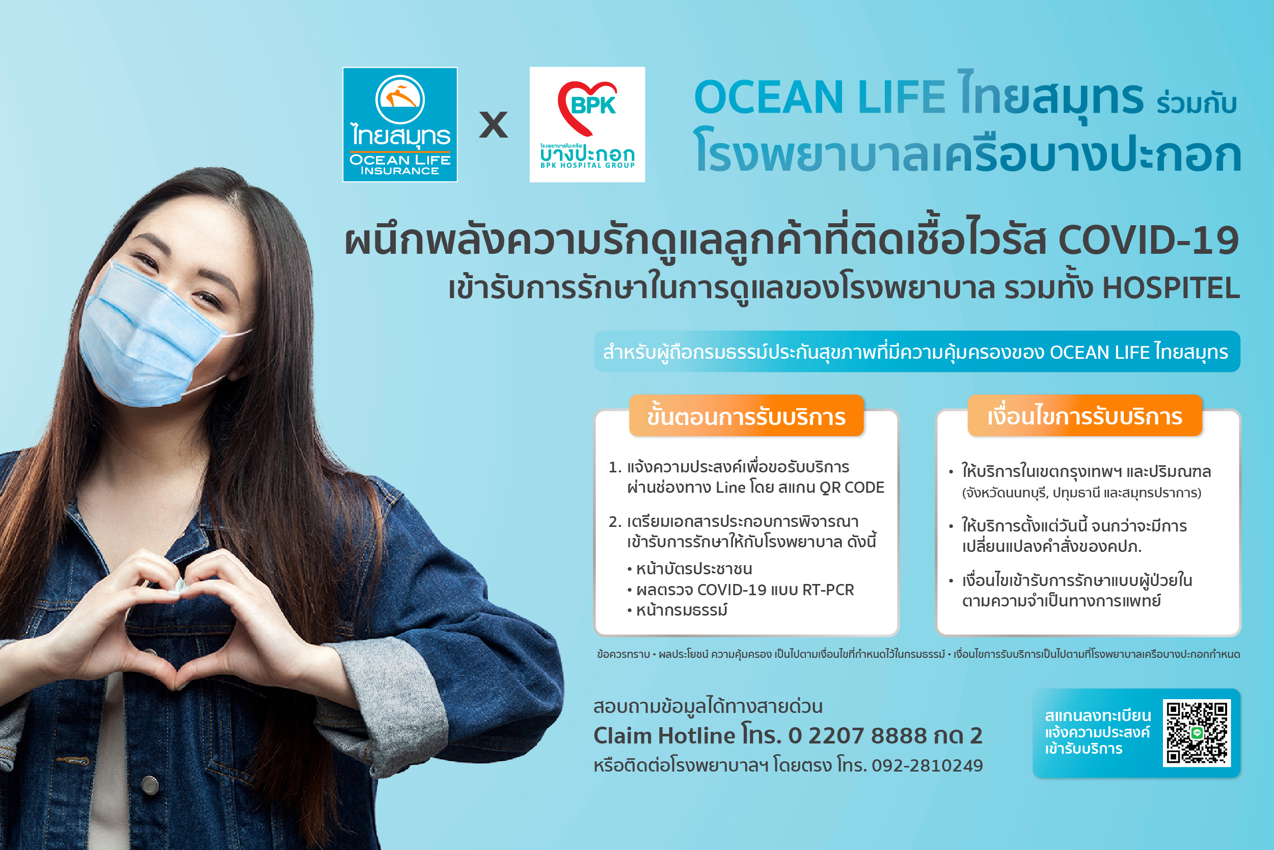 4 พฤศจิกายน 2564 : บมจ.ไทยสมุทรประกันชีวิต รักคือพลังของชีวิต โดยคุณหนึ่งฤทัย นิ่มจินดา ผู้อำนวยการอาวุโส ฝ่ายการตลาดประกันชีวิตกลุ่ม และคุณสมรัฐ กุลจารุโอภาส ผู้อำนวยการฝ่ายการตลาด ตระหนักดีว่าถึงแม้สถานการณ์ COVID – 19 โดยรวมจะมีแนวโน้มดีขึ้น แต่ก็ยังนิ่งนอนใจไม่ได้ เพราะการแพร่ระบาดรุนแรงอาจเกิดขึ้นอีก ดังนั้น เพื่อให้ลูกค้าผู้ถือกรมธรรม์ประกันสุขภาพที่มีความคุ้มครองของ OCEAN LIFE ไทยสมุทร ทั้งประกันรายเดี่ยว และประกันกลุ่ม มั่นใจได้ว่าจะได้รับการดูแลเป็นอย่างดีตลอดการรักษา จึงได้ผนึกพลังความรักร่วมกับพันธมิตร โรงพยาบาลในเครือบางปะกอก