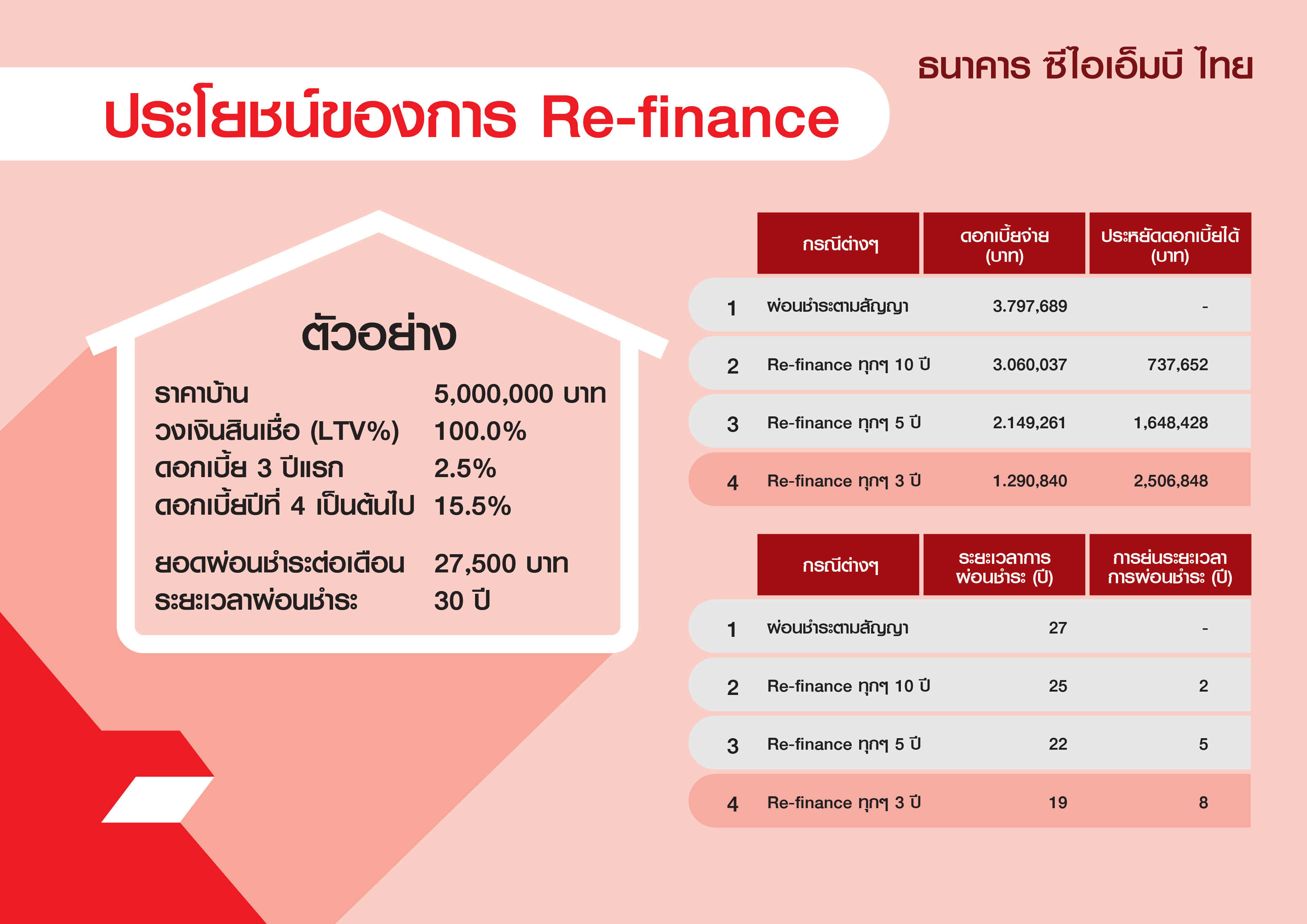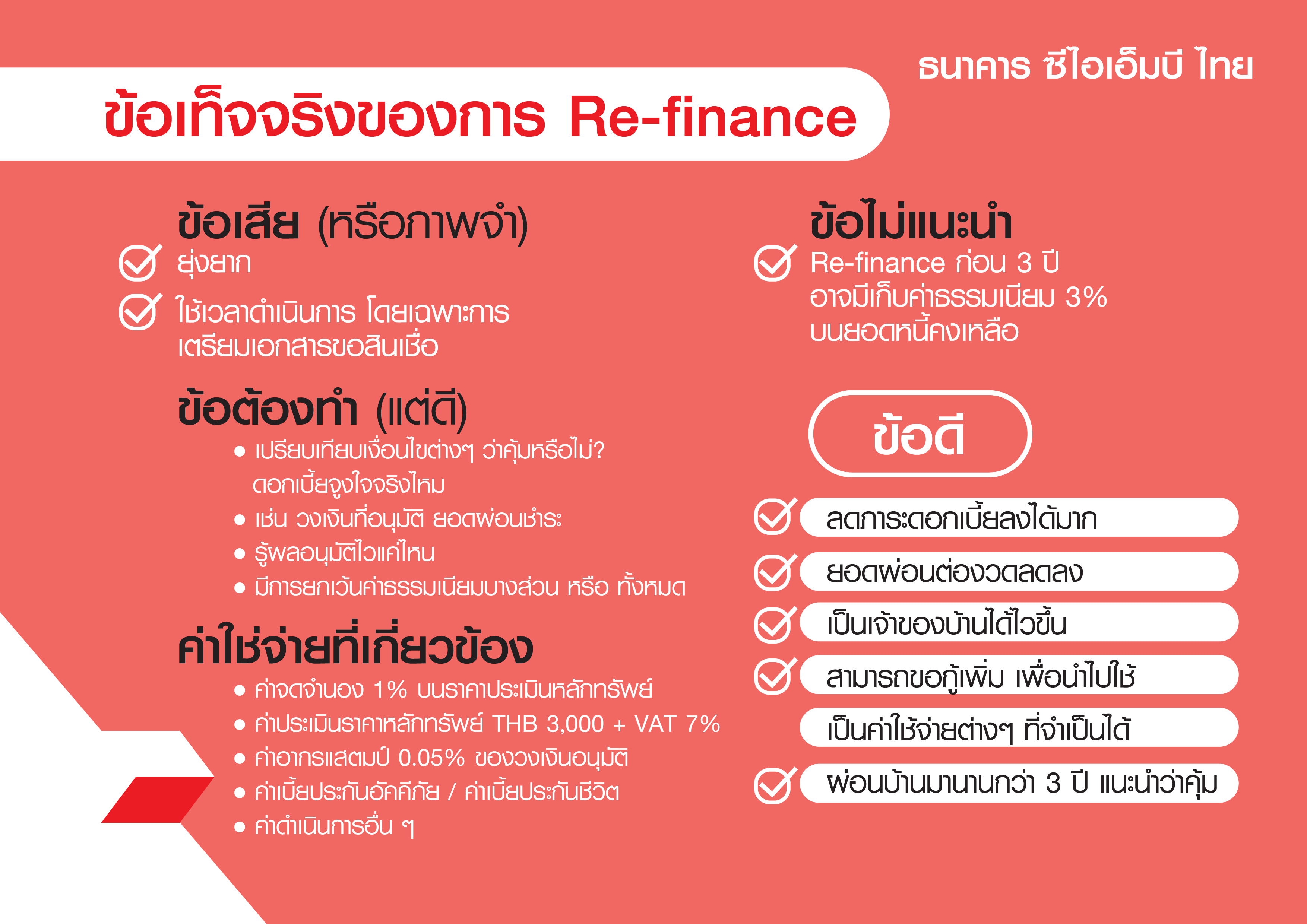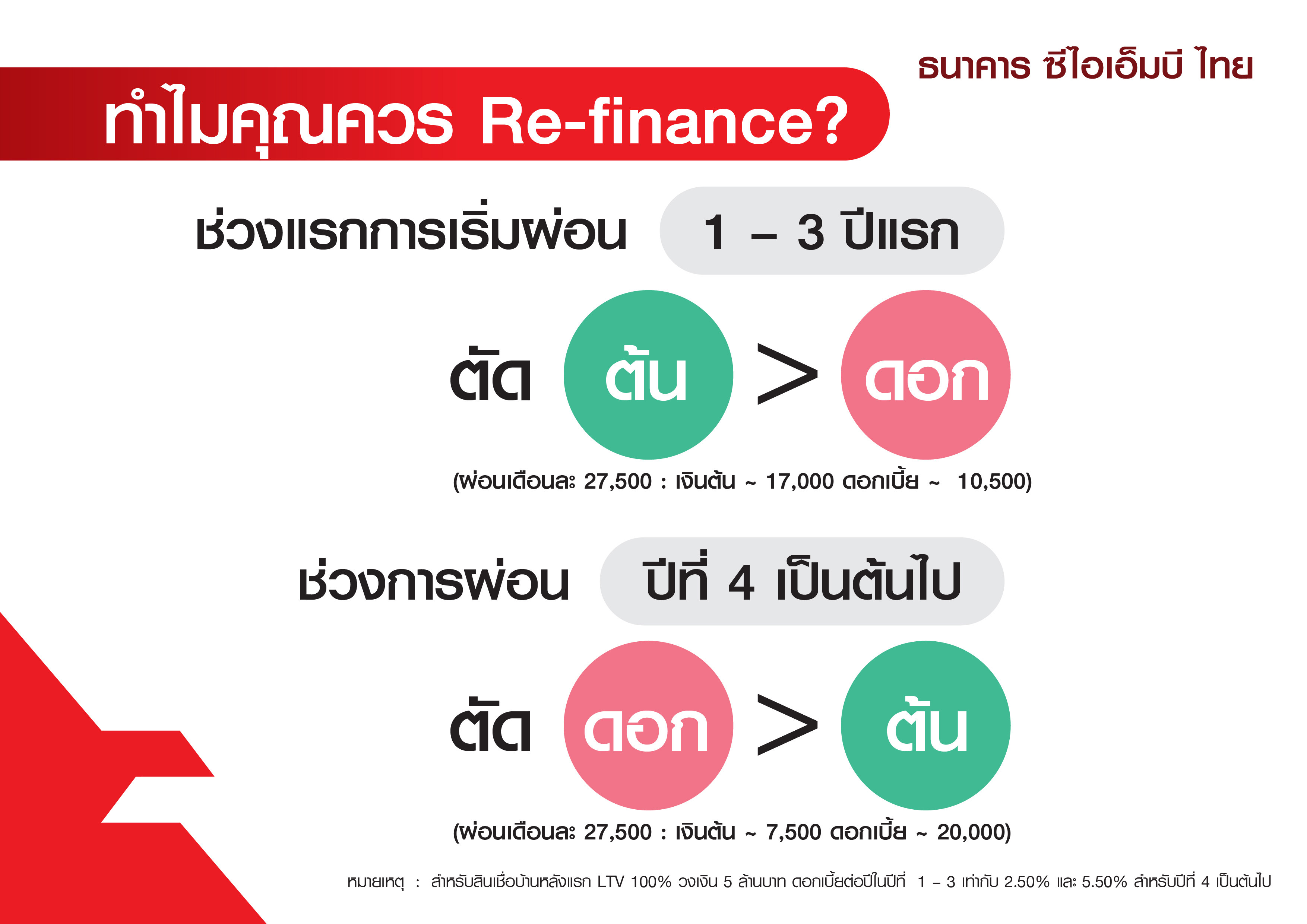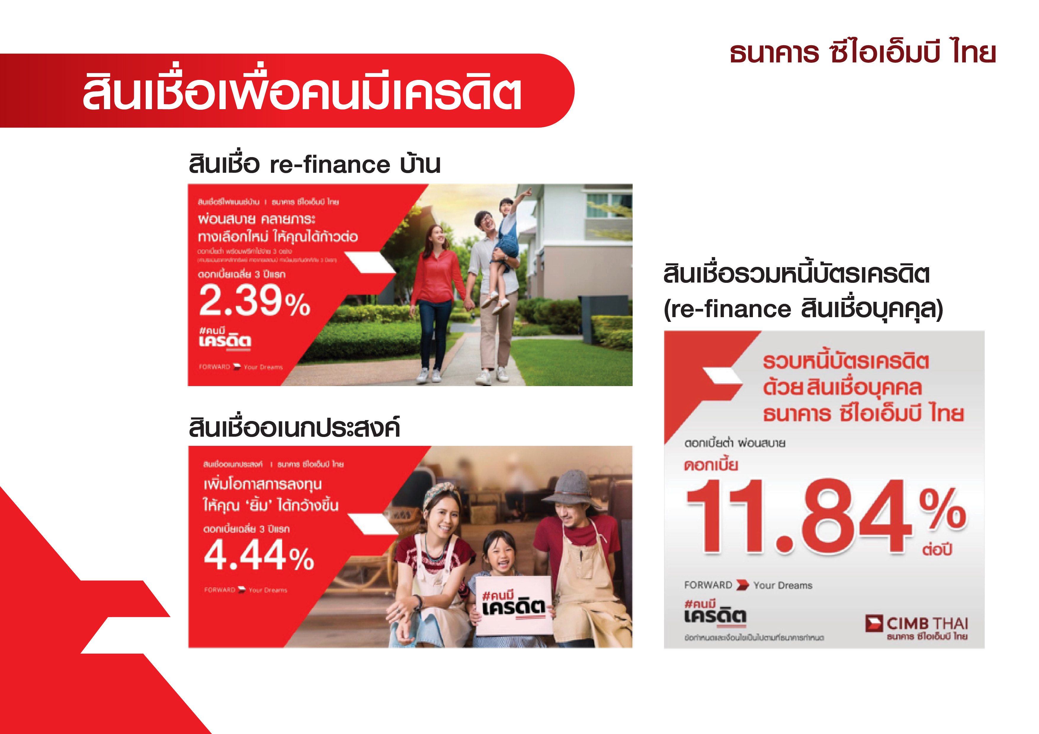 4 พฤศจิกายน 2564 : นายเอกสิทธิ์ พฤฒิพลากร ผู้บริหารผลิตภัณฑ์ธุรกิจรายย่อย ธนาคาร ซีไอเอ็มบี ไทย เปิดเผยว่า ยังมีลูกค้าสินเชื่อบ้านในระบบอีกจำนวนมากที่ผ่อนชำระค่างวดนานมากกว่า 3 ปื ซึ่งในปัจจุบันดอกเบี้ยปีที่ 4 เป็นต้นไปโดยเฉลี่ยจะอยู่ที่ประมาณ 4.5% – 5.5% เมื่อเทียบกับดอกเบี้ย 3 ปีแรกโดยเฉลี่ยจะอยู่ที่ประมาณ 2.4% – 2.8% ธนาคารจึงอยากกระตุ้นลูกค้าสินเชื่อบ้านให้ลุกขึ้นมาบริหารหนี้อย่างมีประสิทธิภาพ ลดภาระทางการเงิน ในยุคโควิด ที่เศรษฐกิจยังไม่กลับมาฟื้นตัวเต็มที่ ด้วยการรีไฟแนนซ์ โดยมองหาสินเชื่อโปรแกรมใหม่ ที่เสนอดอกเบี้ยที่ถูกกว่า