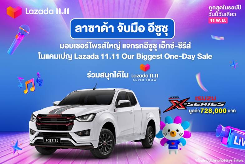 นอกจากนี้ลาซาด้าต้องขอขอบคุณอีซูซุ ที่ร่วมเป็นส่วนหนึ่งในแคมเปญช้อปสุดยิ่งใหญ่แห่งปีของเรา Lazada 11.11 Our Biggest One-Day Sale ด้วยการมอบดีลส่วนลดสินค้าที่ดีที่สุดและยังมีกิจกรรมให้นักช้อปได้ลุ้นรับของรางวัลสุดยิ่งใหญ่อย่างรถอีซูซุ เอ็กซ์ - ซีรี่ส์ รุ่นสปีด ในงาน Lazada 11.11 Super Show อีกด้วย ถือได้ว่าความร่วมมือในครั้งนี้เป็นปรากฏการณ์ครั้งยิ่งใหญ่ของวงการอีคอมเมิร์ซและรถยนต์อย่างแท้จริง”