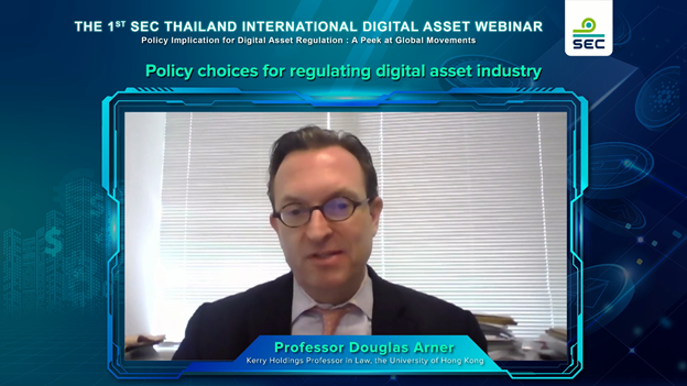 ศาสตราจารย์ Douglas Arner อาจารย์คณะนิติศาสตร์ มหาวิทยาลัยฮ่องกง ให้มุมมองเกี่ยวกับข้อเสนอแนะเชิงนโยบายต่อการกำกับดูแลอุตสาหกรรมสินทรัพย์ดิจิทัลว่า นับแต่วิกฤตการเงินในปี 2008 จนถึงปัจจุบัน มีการสร้างนวัตกรรมทางการเงินเกิดขึ้นมากมาย รวมถึงการให้บริการทางการเงินในรูปแบบกระจายศูนย์ และสินทรัพย์ดิจิทัลเติบโตอย่างรวดเร็ว โดยเฉพาะตั้งแต่ช่วงการแพร่ระบาดของ COVID-19 ทำให้หน่วยงานกำกับดูแลอาจมีข้อกังวลในเรื่องเสถียรภาพของระบบการเงิน ความเสี่ยงเชิงระบบต่อตลาดการเงิน รวมถึงความไม่เป็นธรรมในตลาดและการเอาเปรียบประชาชน