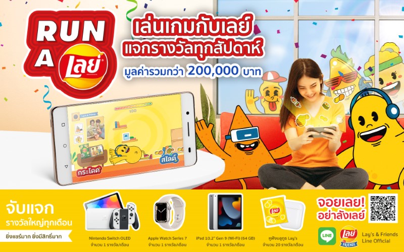 และครั้งแรกของเกมออนไลน์จากเลย์ Run A Lay's ชวนแฟนๆ มาเล่นเกมกับเลย์ วิ่งกระโดดเพื่อเก็บแผ่นชิปเลย์ในเกมจนกว่าเวลาจะหมด แถมได้ลุ้นรางวัลทุกสัปดาห์รวม 8 สัปดาห์ ได้แก่ บัตรกำนัลห้างโลตัสและบิ๊กซี ทรูมันนี่วอลเล็ท และของพรีเมียมจากเลย์อีกมากมาย โดยคัดเลือกจากผู้ที่ได้คะแนนสูงสุด 60 อันดับทุกสัปดาห์ และ ลุ้นต่อที่ 2 จับฉลากรางวัลใหญ่ทุกเดือน