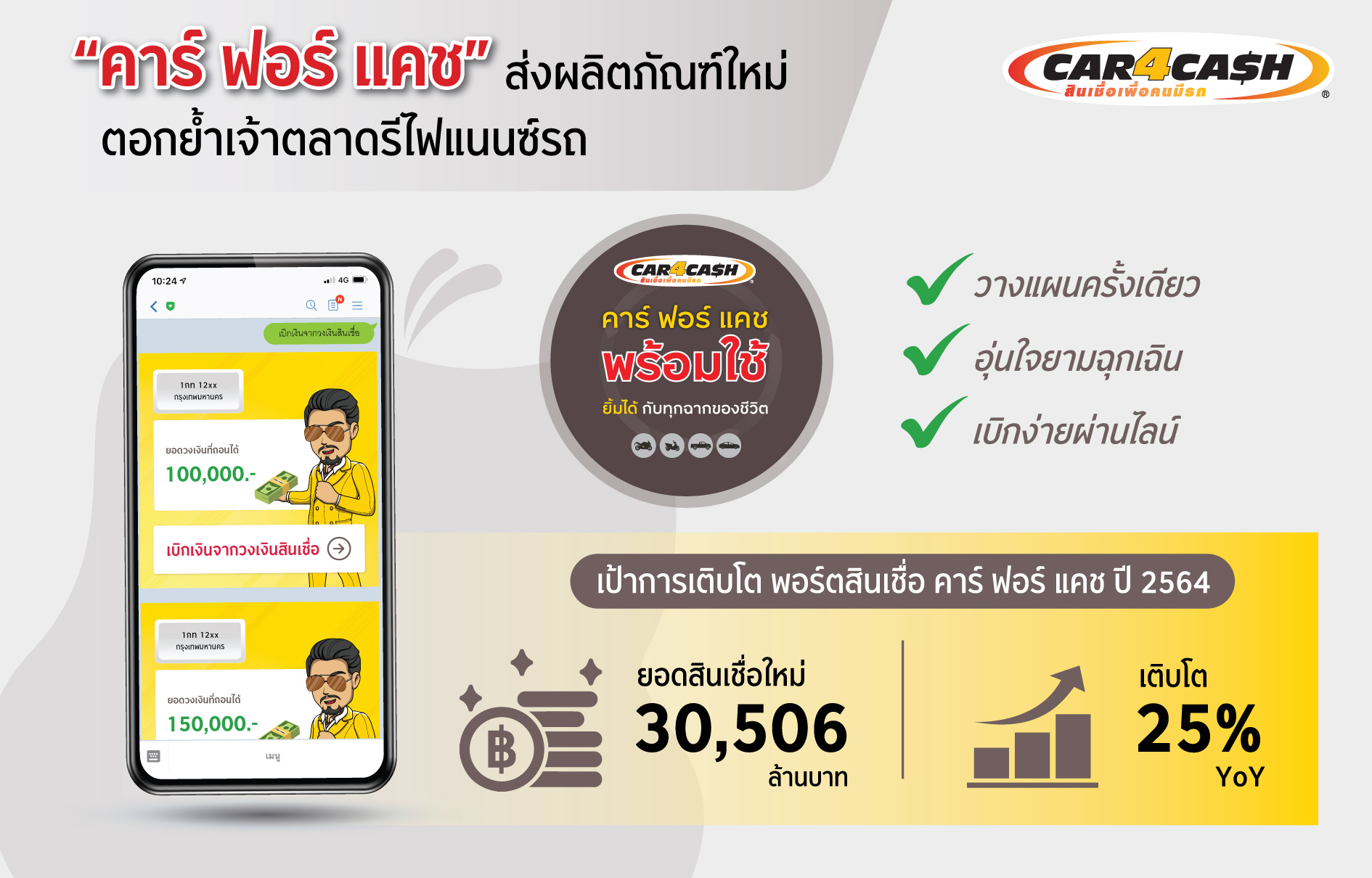 นอกจากนี้ คาร์ ฟอร์ แคช พร้อมใช้ จะยังเป็นปัจจัยขับเคลื่อนการเติบโตที่สำคัญในช่วงโค้งสุดท้ายของปี โดยเราตั้งเป้าว่า ยอดสินเชื่อใหม่ของ คาร์ ฟอร์ แคช ในปี 2564 จะเติบโต 25% จากปีก่อนหน้า หรือมีมูลค่า 30,506 ล้านบาท โดยผลงานของยอดสินเชื่อช่วง 6 เดือน ทำได้ 15,000 ล้านบาท ทำให้เรายังคงครองตำแหน่งผู้นำตลาดสินเชื่อเพื่อคนมีรถได้อย่างแข็งแกร่งต่อไป” นางกฤติยา กล่าวสรุป