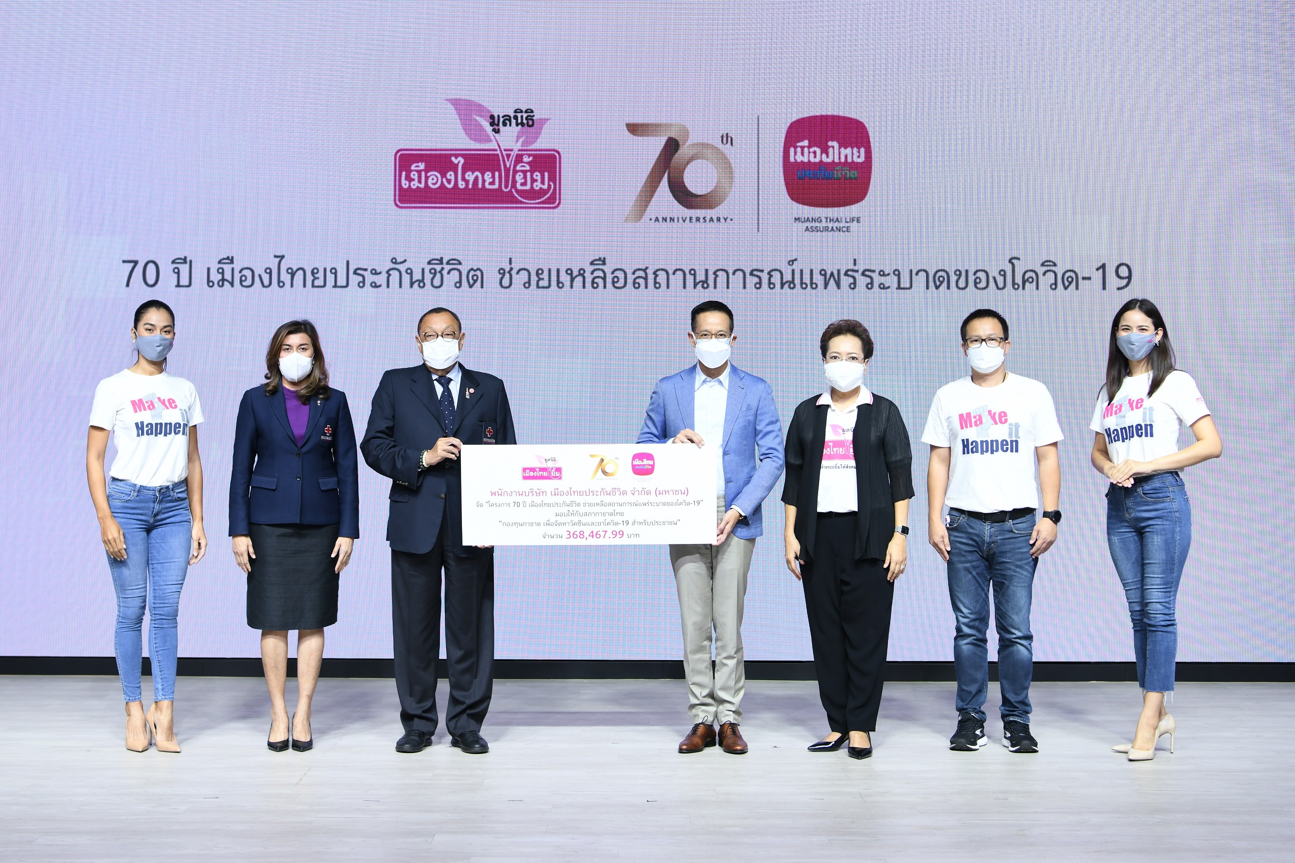 19 พฤศจิกายน 2564 : สาระ ล่ำซำ ประธานเจ้าหน้าที่บริหาร, พุฒิ เด่นสมพรพันธ์ รองกรรมการผู้จัดการ บริษัท เมืองไทยประกันชีวิต จำกัด (มหาชน) ร่วมกับมูลนิธิเมืองไทยยิ้ม โดย พิตราภรณ์ บุณยรัตพันธุ์ รองประธานกรรมการมูลนิธิเมืองไทยยิ้ม บริจาคเงินสมทบที่ได้รับการบริจาคจากผู้บริหารและพนักงานผ่านมูลนิธิเมืองไทยยิ้ม “โครงการช่วยเหลือสถานการณ์แพร่ระบาดของโควิด-19” เนื่องในโอกาสครบรอบ 70 ปี เมืองไทยประกันชีวิต เป็นจำนวน 368,467.99 บาท ให้แก่ สภากาชาดไทยโดยมี ขรรค์ ประจวบเหมาะ ผู้อำนวยการ สำนักงานจัดหารายได้ สภากาชาดไทย และ กมลวรรณ ศรีช่วย หัวหน้าฝ่ายหารายได้และกิจกรรม สภากาชาดไทย เป็นผู้รับมอบ โดยกองทุนกาชาดจะนำเงินดังกล่าวไปจัดหาวัคซีนและยาโควิด-19 สำหรับประชาชน ณ เมืองไทยประกันชีวิต สำนักงานใหญ่ ![]()