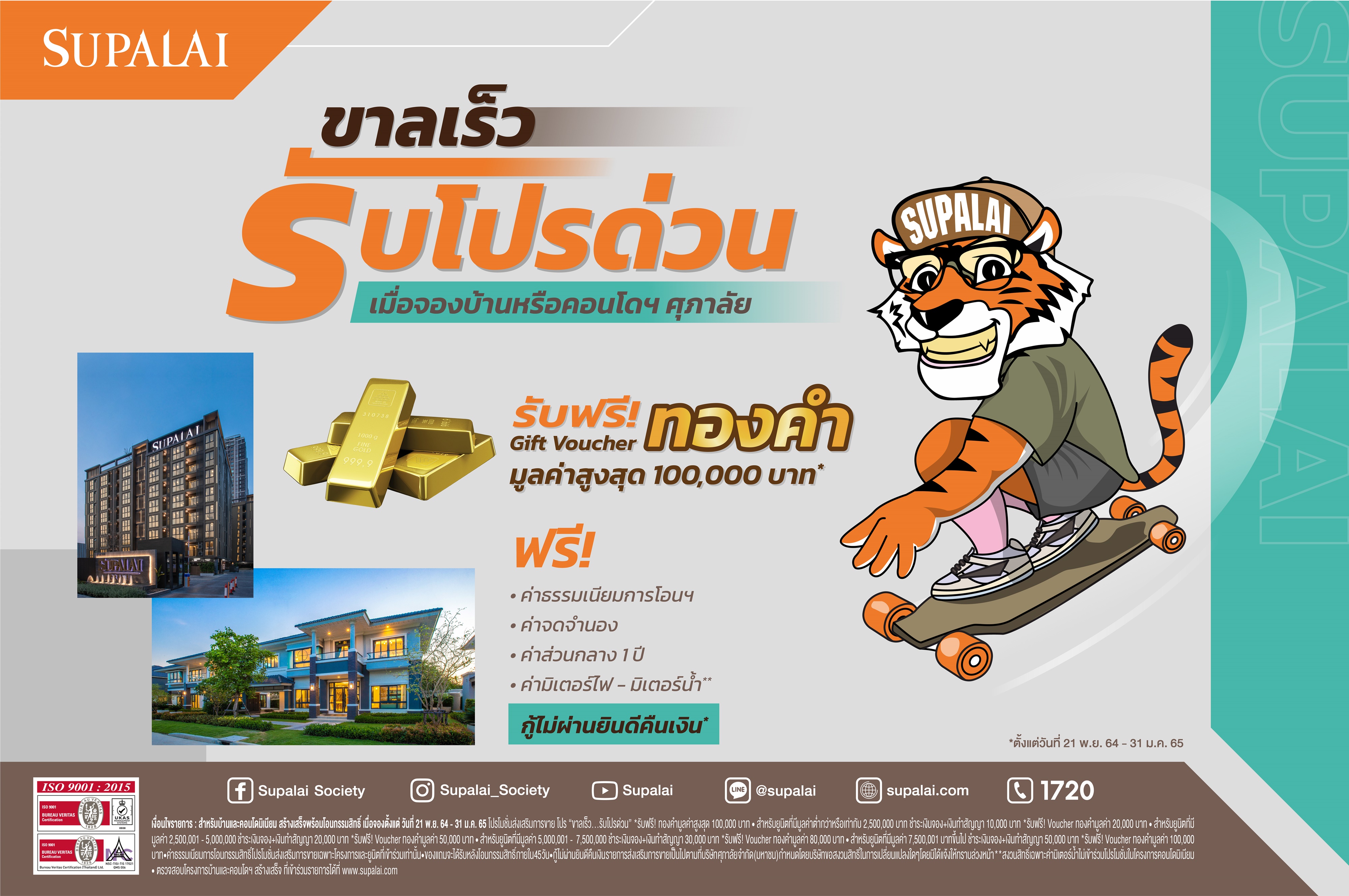 โดยลูกค้าสามารถเข้าถึงที่อยู่อาศัยได้ง่ายขึ้น ขณะที่ผู้ประกอบการเองก็สามารถบริหารจัดการสินค้าในสต๊อกได้ดีขึ้น สำหรับบริษัทฯ ได้ปล่อยโปรฯ ที่มีการตอบรับที่ดีจากลูกค้ามาอย่างต่อเนื่อง รวมทั้งโปรฯ ด่วนต้อนรับปีขาลเพื่อขานรับมาตรการของรัฐและผู้ที่กำลังมองหาที่อยู่อาศัยในช่วงปลายปีนี้จนถึงต้นปี 2565 จึงเป็นที่มาของแคมเปญ “Supalai Early Fast Deals ขาลเร็ว…รับโปรด่วน”* กับโครงการบ้านและคอนโดมิเนียมสร้างเสร็จพร้อมอยู่ทั้งในกรุงเทพฯ ปริมณฑลและภูมิภาค ราคาเริ่มเพียง 1 ล้านกว่าบาท พร้อมรับข้อเสนอสุดพิเศษ